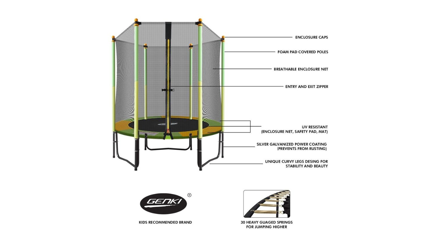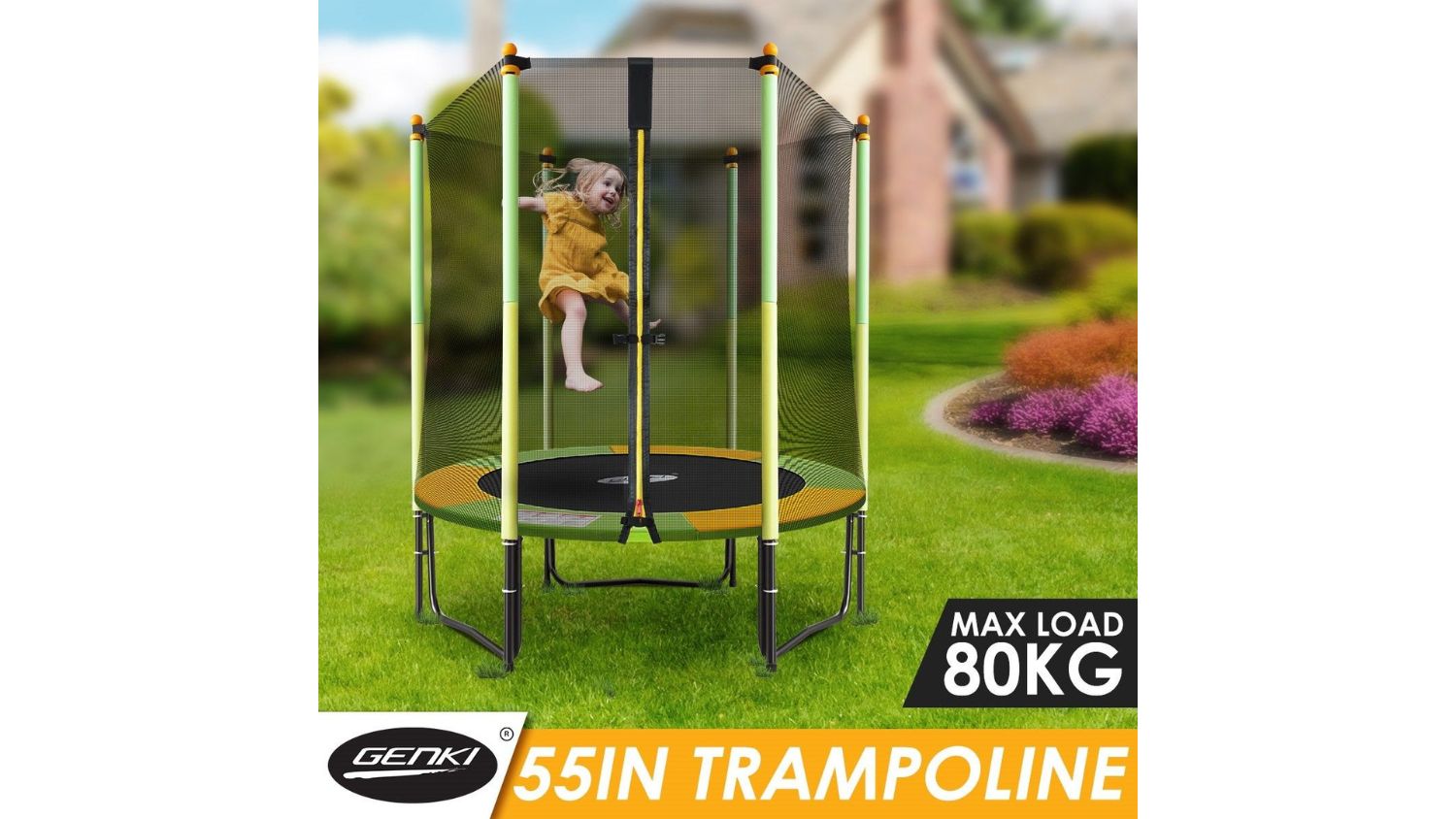 Let your children jump and have fun with the Genki Rebounder Trampoline with Safety Net 1.4m. Designed with durability in mind, it features a galvanised steel frame, heavy‑duty spring pad, and a weather‑resistant jump mat ready for outdoor play. The sturdy three‑leg base helps maintain balance, while the surrounding safety net offers protection and easy access through a zippered door.