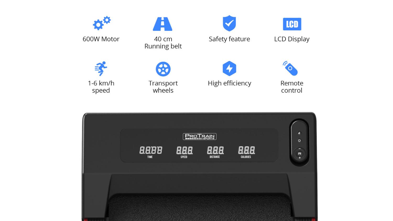 Get your cardio on with the space-saving PROTRAIN Slimline Walking Pad! Equipped with an anti-slip belt, ultra-quiet motor, and a bright LCD, it's the perfect way to squeeze fitness into your busy day. It also keeps track of your time, speed, distance, and calories burned. Plus, the remote control ensures quick emergency stops.