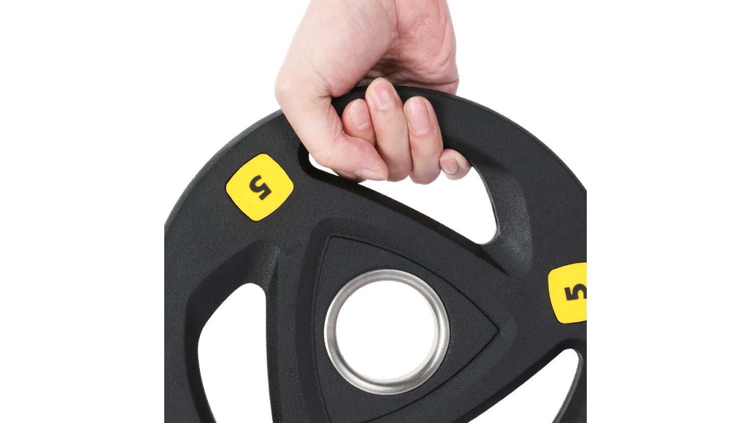 Maximise your training sessions with Everfit Weight Plates with Handle Spaces 5kg. The weight plates are constructed from heavy-duty cast iron and are designed to be sturdy and tough for all your exercise needs. The plates are covered in a tough rubber coating with a three-hole grip for easy handling. These weight plates are simple to use and compatible with most bars, making them versatile for use with dumbbells, barbells, or on their own.