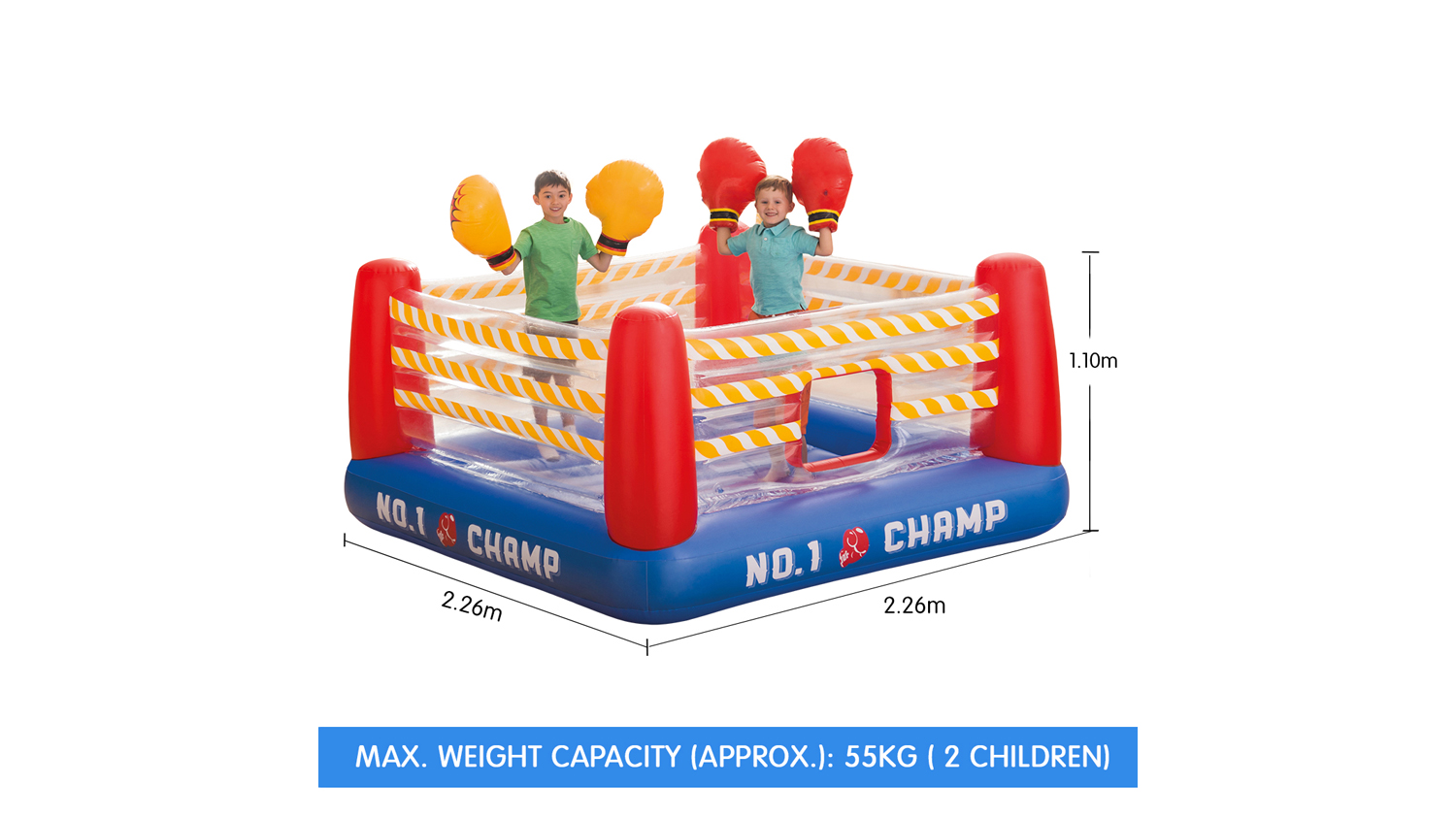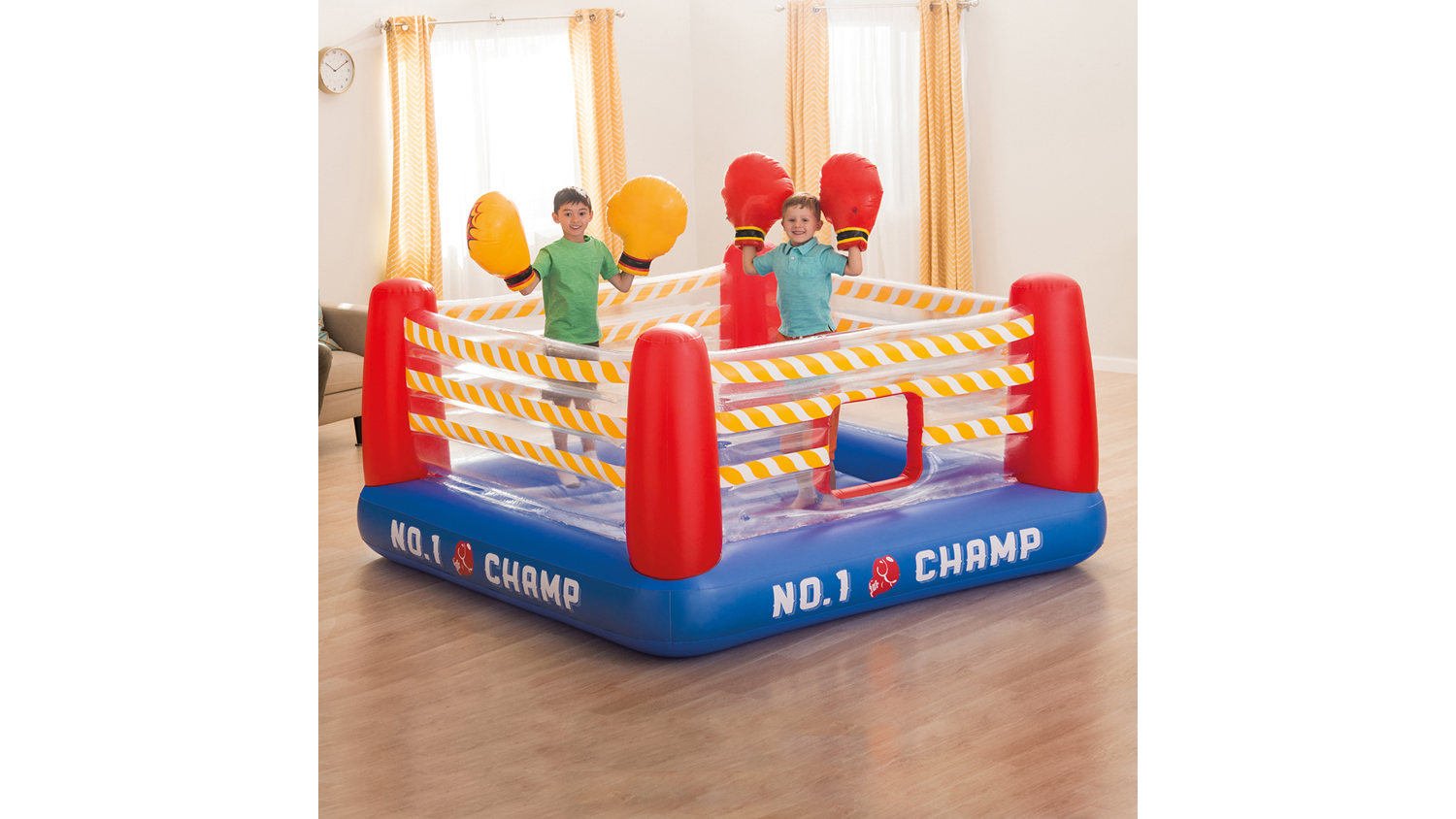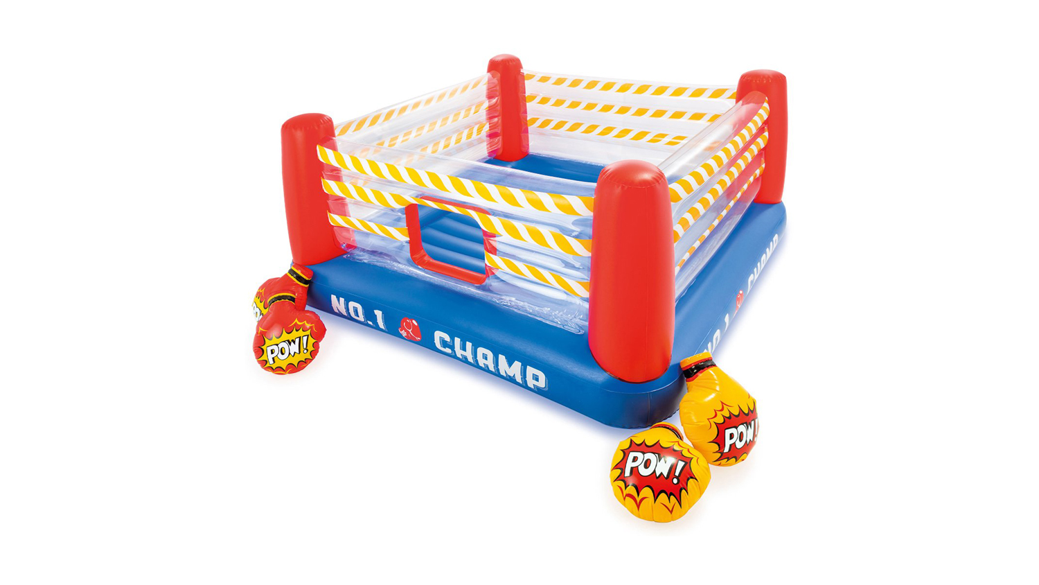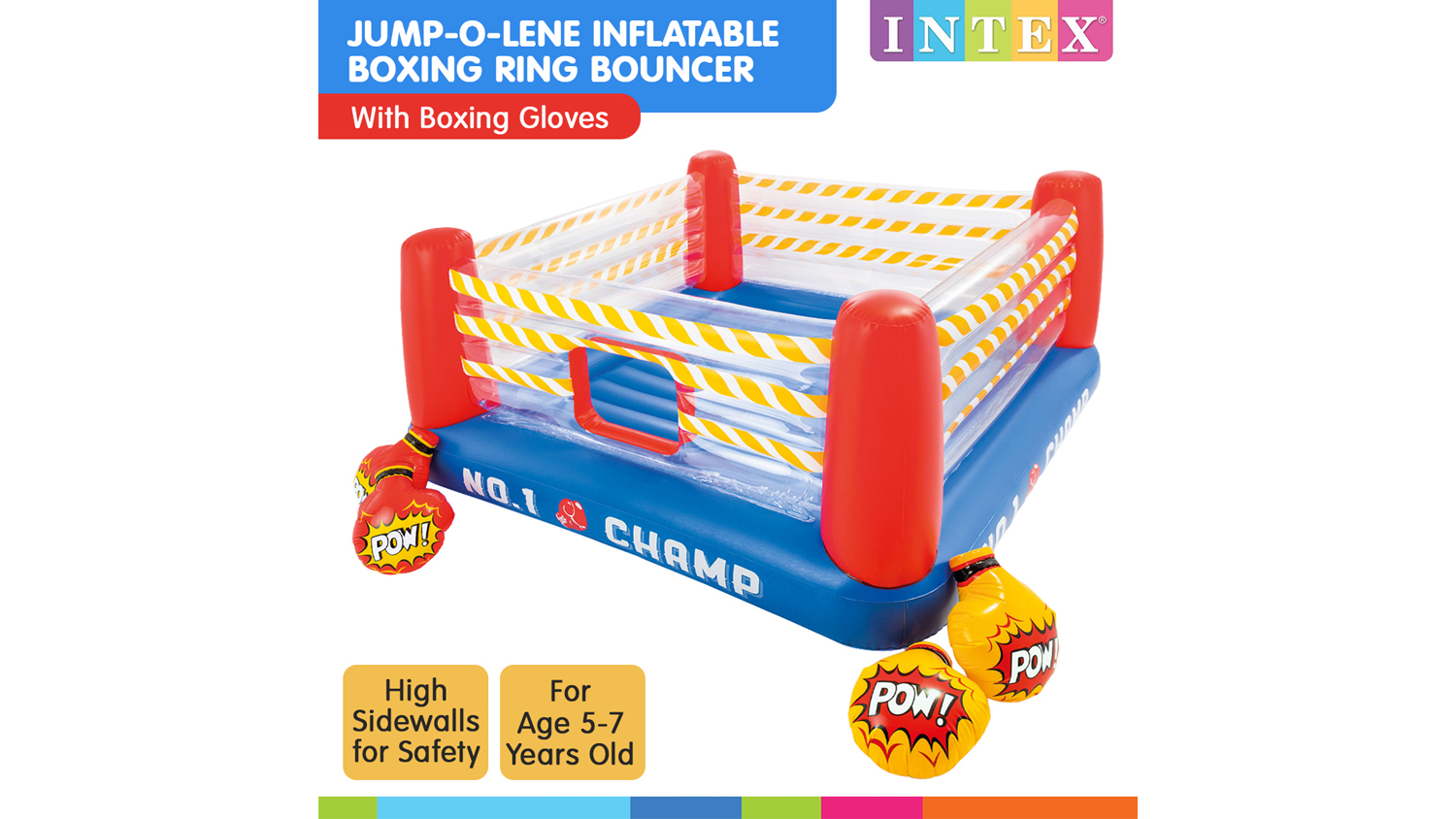 Let your mini athletes practice their boxing skills with this Intex Jump-O-Lene Kids Inflatable Boxing Ring! This bouncer flaunts a crawl-through door, inflatable base and floor, and is enclosed with high sidewalls for enhanced security and safety. It also offers two pairs of inflatable boxing gloves to add to the excitement. Watch your kids have fun with a round of pretend-boxing!