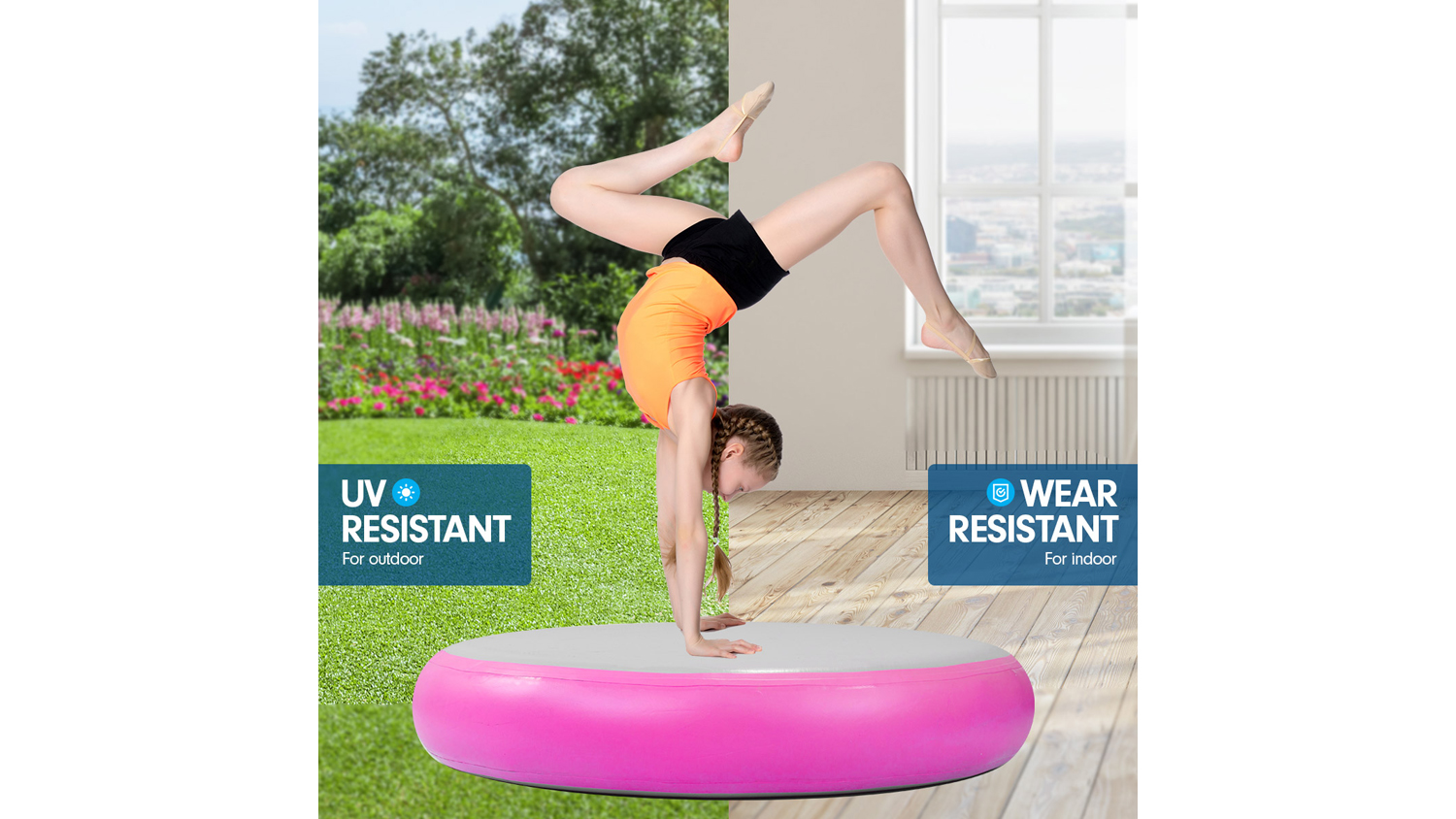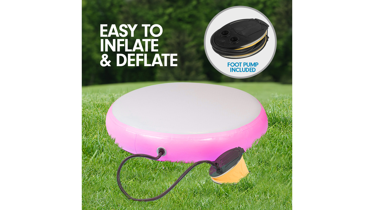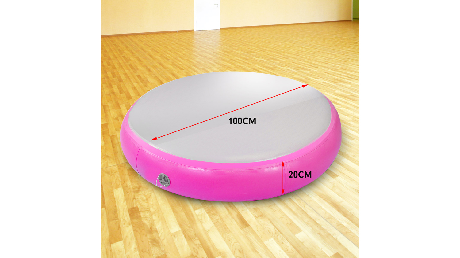 Level up your workout sessions with the Powertrain 1m Airtrack Spot Round Inflatable Gymnastics Mat! A reliable companion for cheerleading, gymnastics, gym sessions, fitness club events, and other high-intensity sports or competitions, this mat is an exceptional landing platform. It boasts drop stitch material and a 1.2 mm thick PVC tarpaulin, offering superior air tightness and durability.