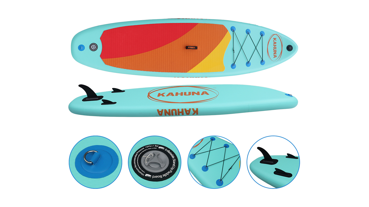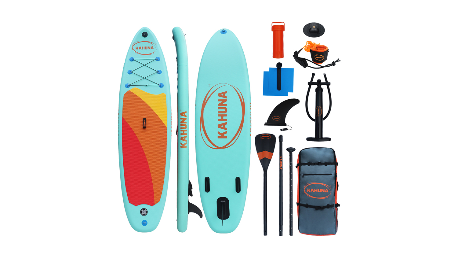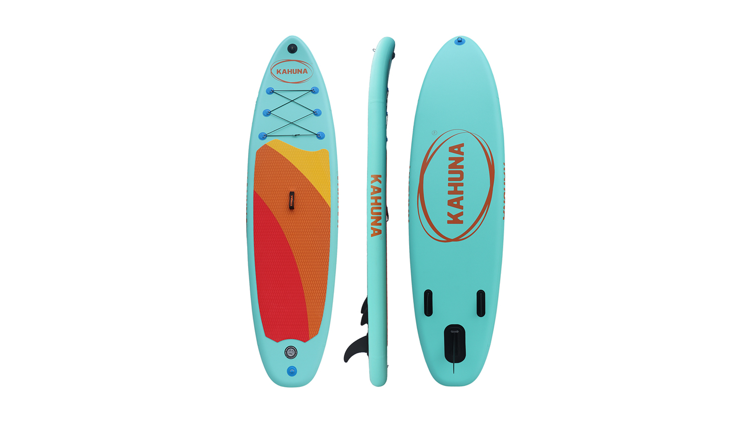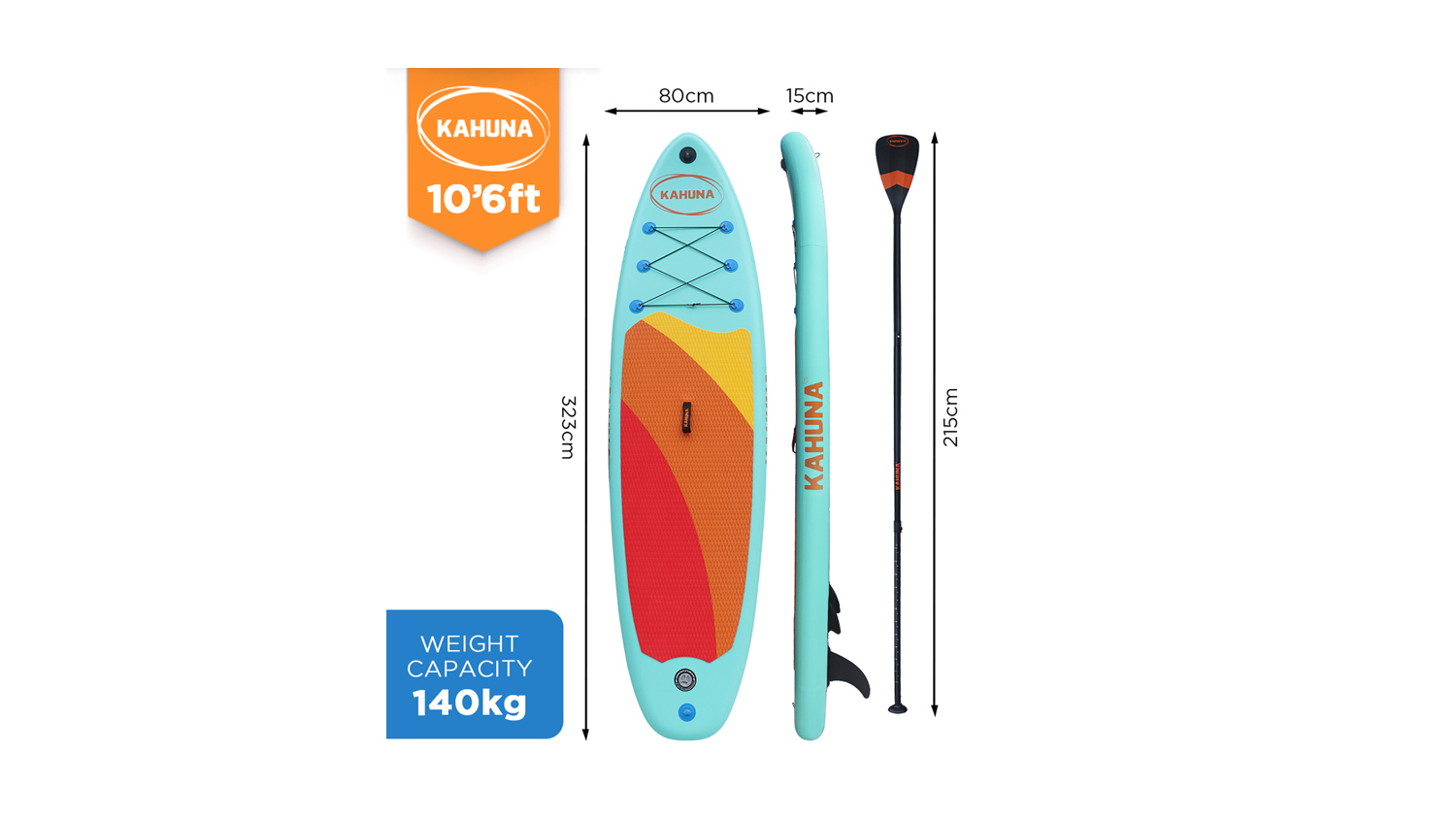 Have a blast at the beach with Kahuna 10.6ft Inflatable Stand-Up Paddle Board! This complete iSUP package is the ultimate companion when surfing, cruising, and exploring the water. Great for professionals and hobbyists alike, this paddleboard boasts top-quality drop-stitch weave and a reinforced multi-layer PVC exterior. It also features an adjustable aluminum paddle for easy maneuvering, two side fins for superior speed and smooth steering, and a removable centre fin. Whether you love yoga, touring, surfing, or simply stand-up paddle boarding, this 10ft 6” board is the perfect choice for fun and relaxation.