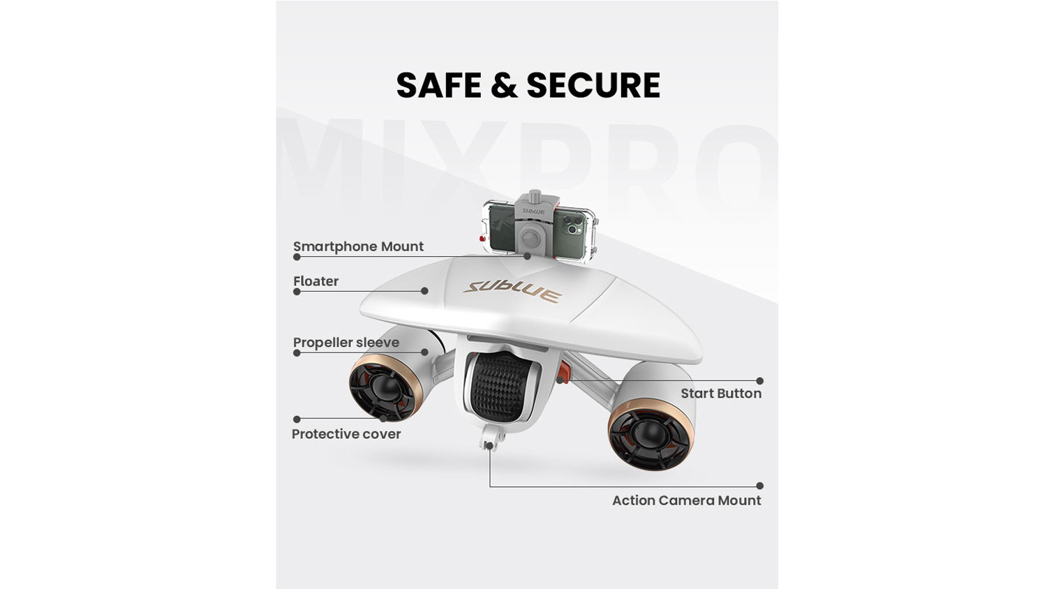 Document your fun aquatic adventures with the help of the Sublue Whiteshark Mixpro Underwater Scooter! A handy companion for travel, this nifty scooter flaunts an ultra-lightweight design and a small double propeller reaching up to 6.4km/h. It boasts various upgraded features such as longer battery life, faster pace, and an optional smartphone mount.