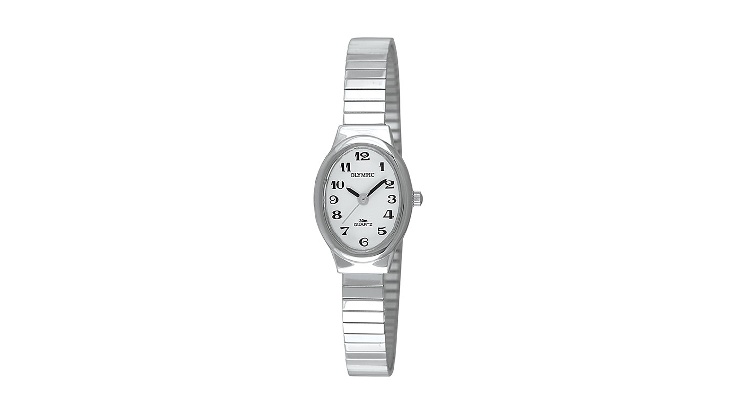 The Olympic Ladies Oval Stainless Steel Watch is a must-have statement piece for everyday looks! Boasting an elegant oval-shaped case, classic stainless steel construction, and a practical expanding band, this sleek accessory will complement any style. Additionally, this watch flaunts reliable 30m water resistance* and a Ronda Swiss-designed movement.