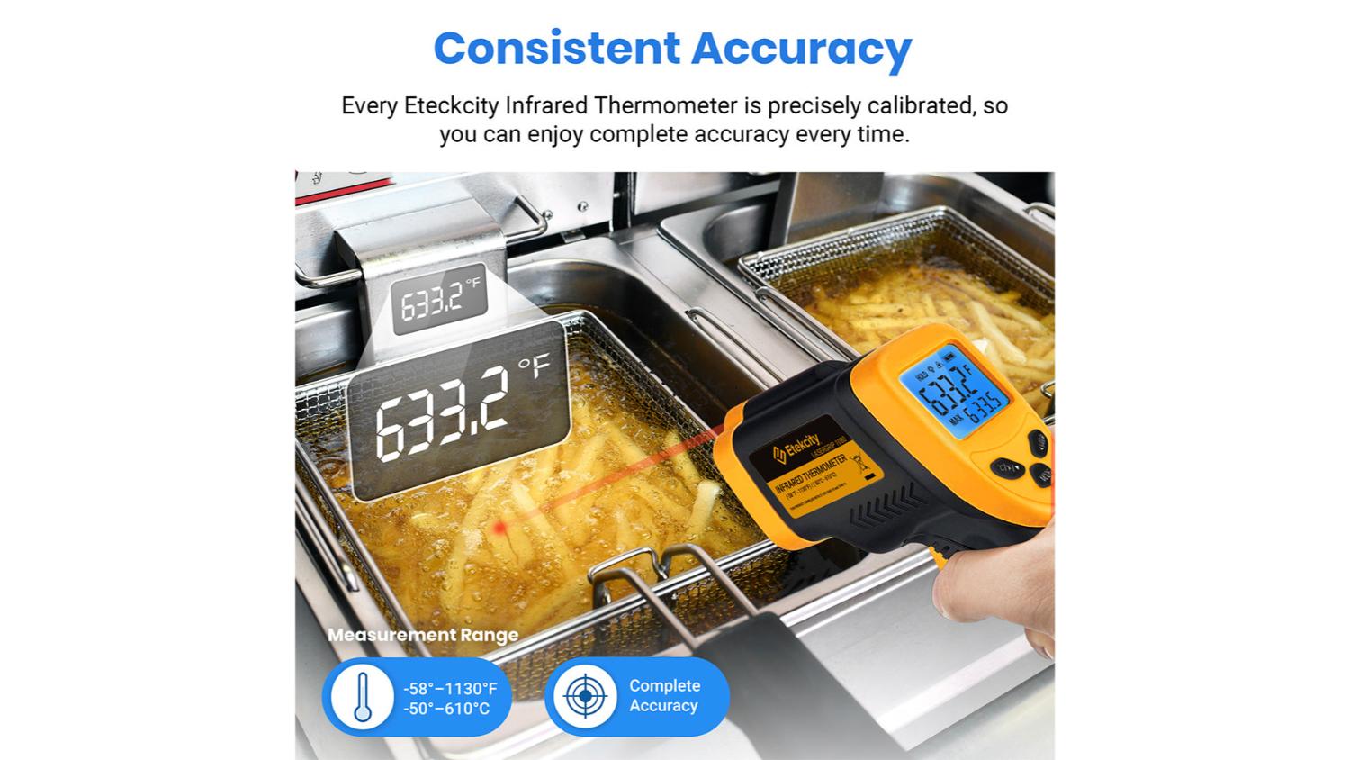 Ensure your temperature readings are always on point with the Etekcity 1080 Lasergrip Handheld Infrared Thermometer 2pcs.! It features an expanded temperature range of -50° to 610°C, delivering results in a swift 500 ms, making it your go-to tool for quick and accurate readings. Navigate effortlessly with professional EMS mode and adjustable emissivity (0.1–1.0), providing precision across various surfaces. Plus, its backlit LCD screen offers unit conversion (°F/°C) and an auto-off feature, adding convenience to your measurement process.