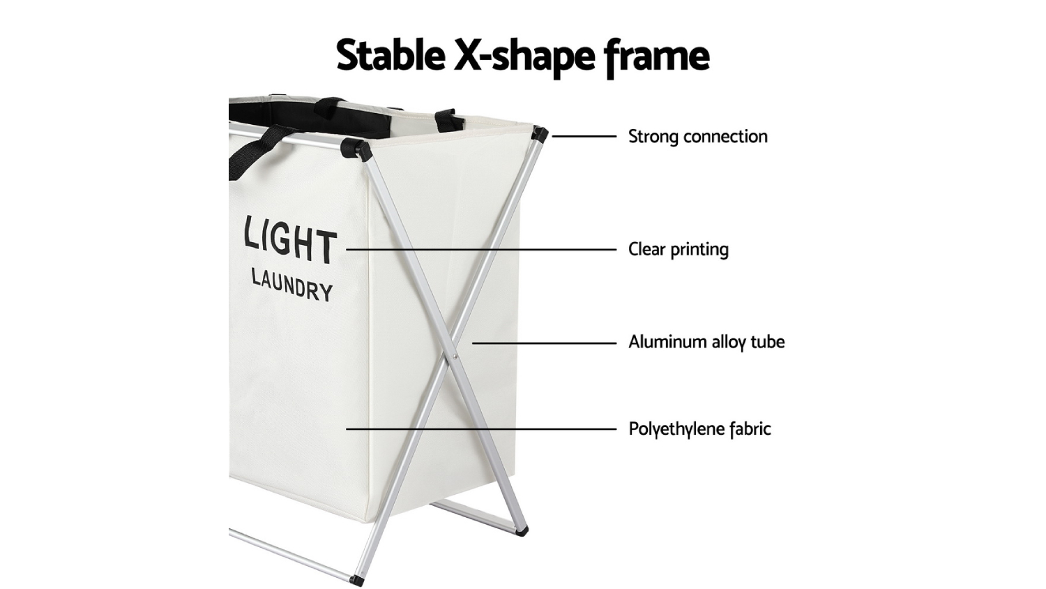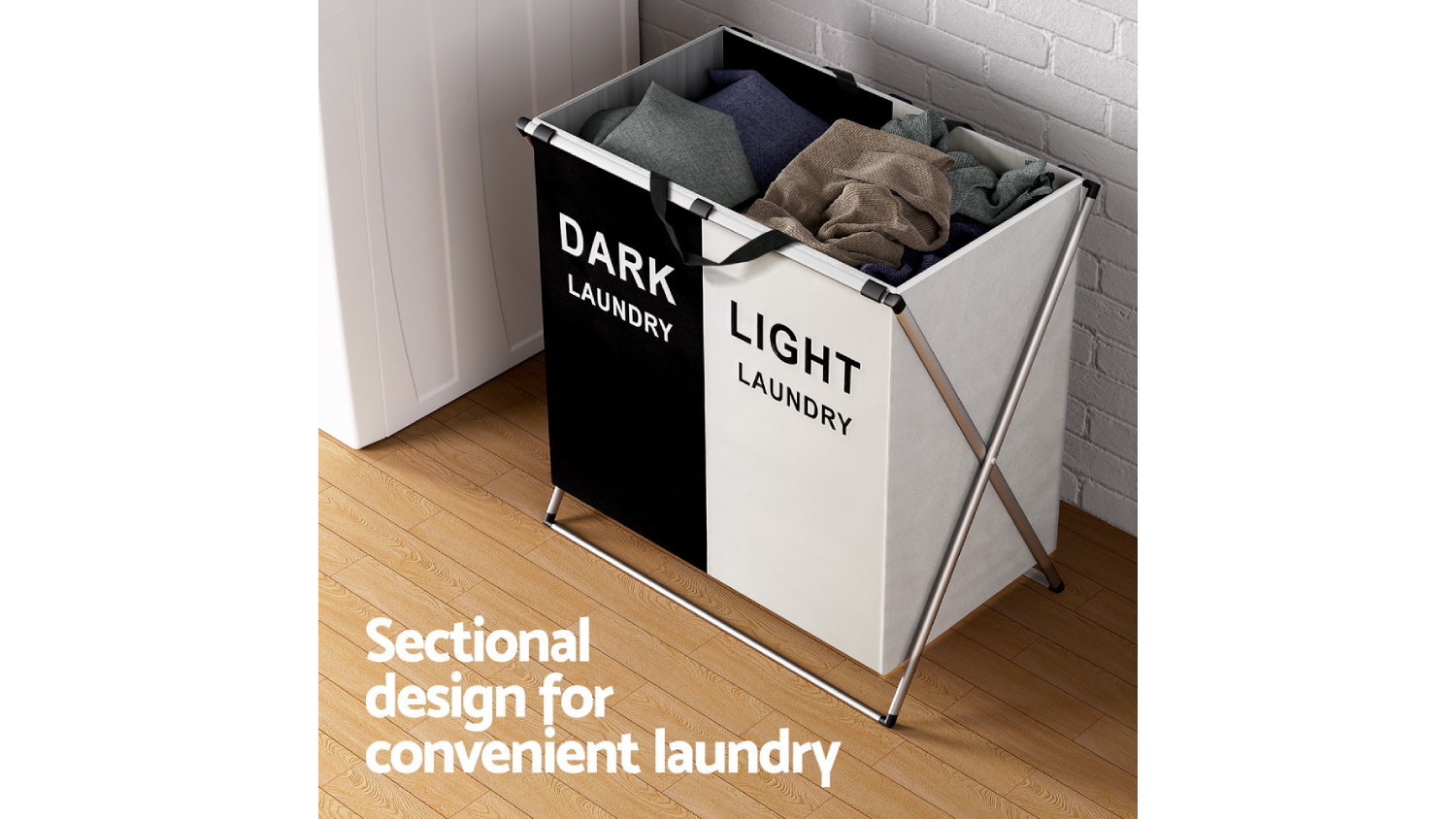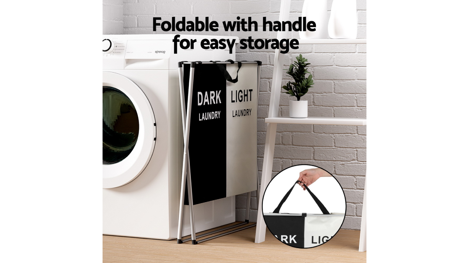 Experience a smoother laundry day with the Artiss Colour Sort Dual Compartment Laundry Hamper. With its two sections, you can easily separate dark, light, and coloured clothing, eliminating the risk of accidental staining. Its large capacity is perfect for busy households. The sturdy X-shaped aluminium alloy frame and tough fabric lining ensure durability, while the foldable design saves precious space when not in use. Plus, the convenient handle makes carrying laundry around the house a breeze. Upgrade your laundry routine with this practical and efficient hamper from Artiss.
