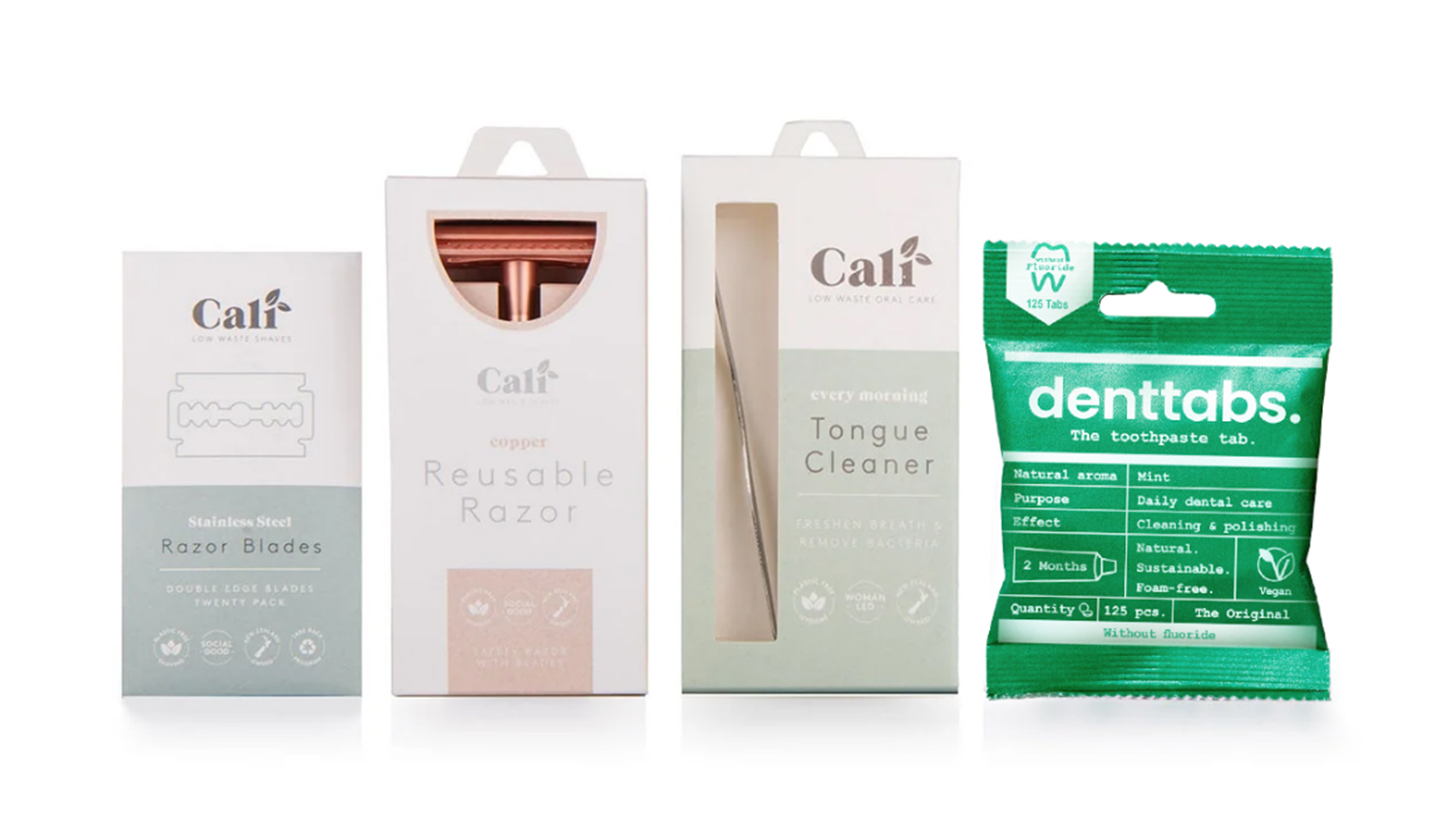 Upgrade your self-care routine with the CaliWoods Bathroom Essentials. This sustainable collection includes a safety razor, blade refill pack, tongue cleaner, and DENTtabs to streamline your daily regimen. It’s the ultimate bathroom upgrade, simplified!