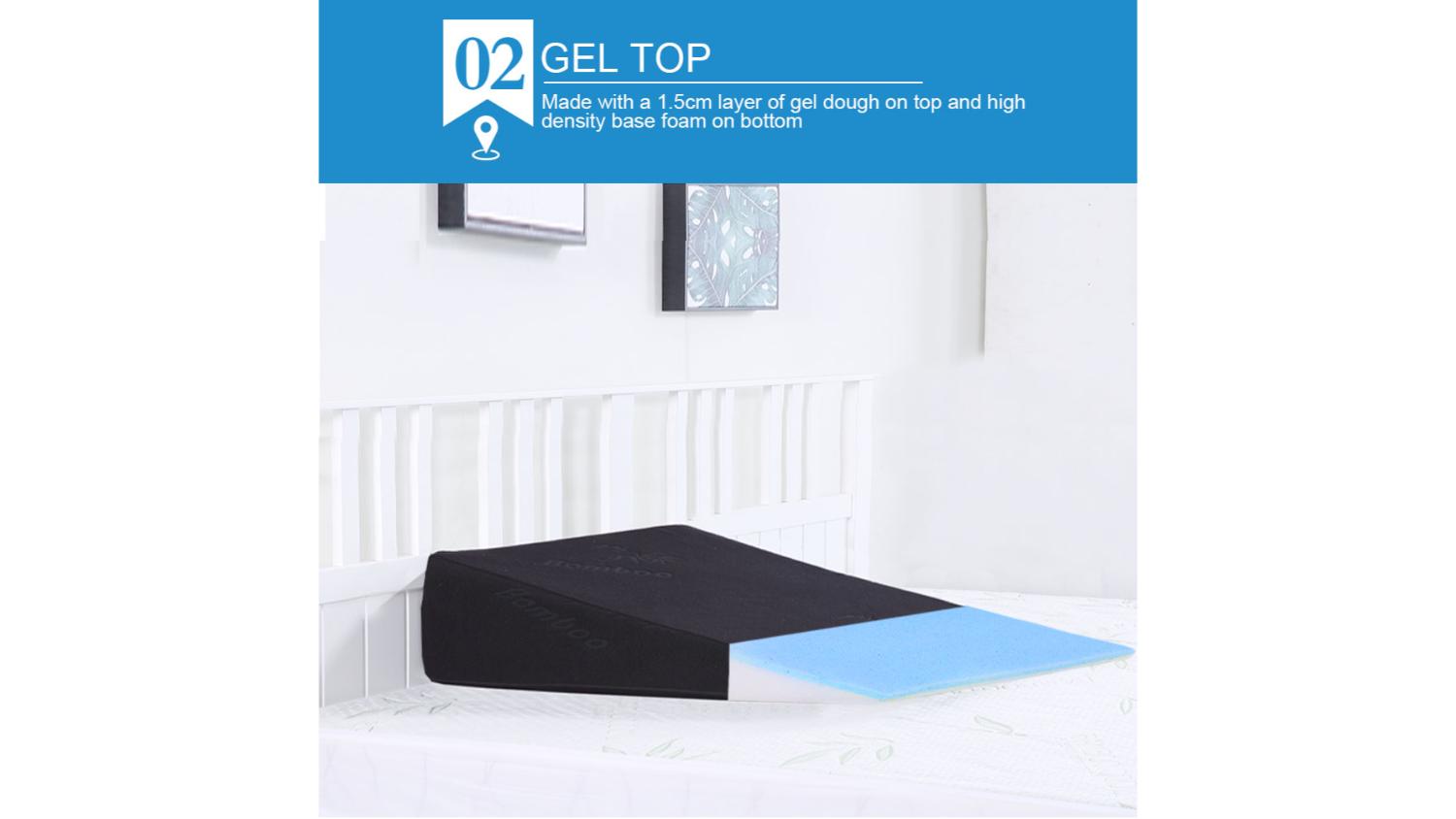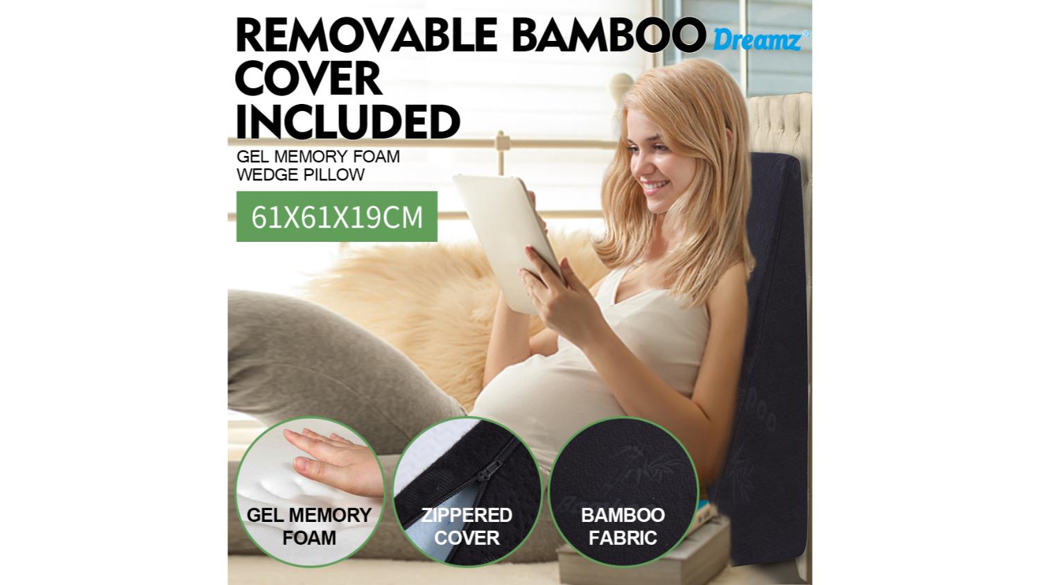 The Dreamz Memory Foam Wedge Pillow 61 x 61 x 19cm is your go-to solution for comfort and support. Designed with cooling gel technology, it keeps you cool while offering pressure relief for improved circulation. Whether you're sitting or lying down, it elevates your body comfortably and is perfect for various uses.