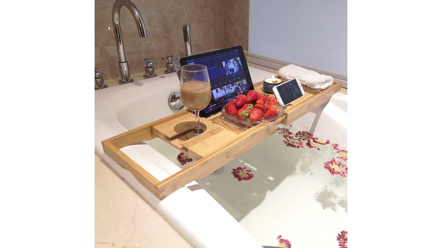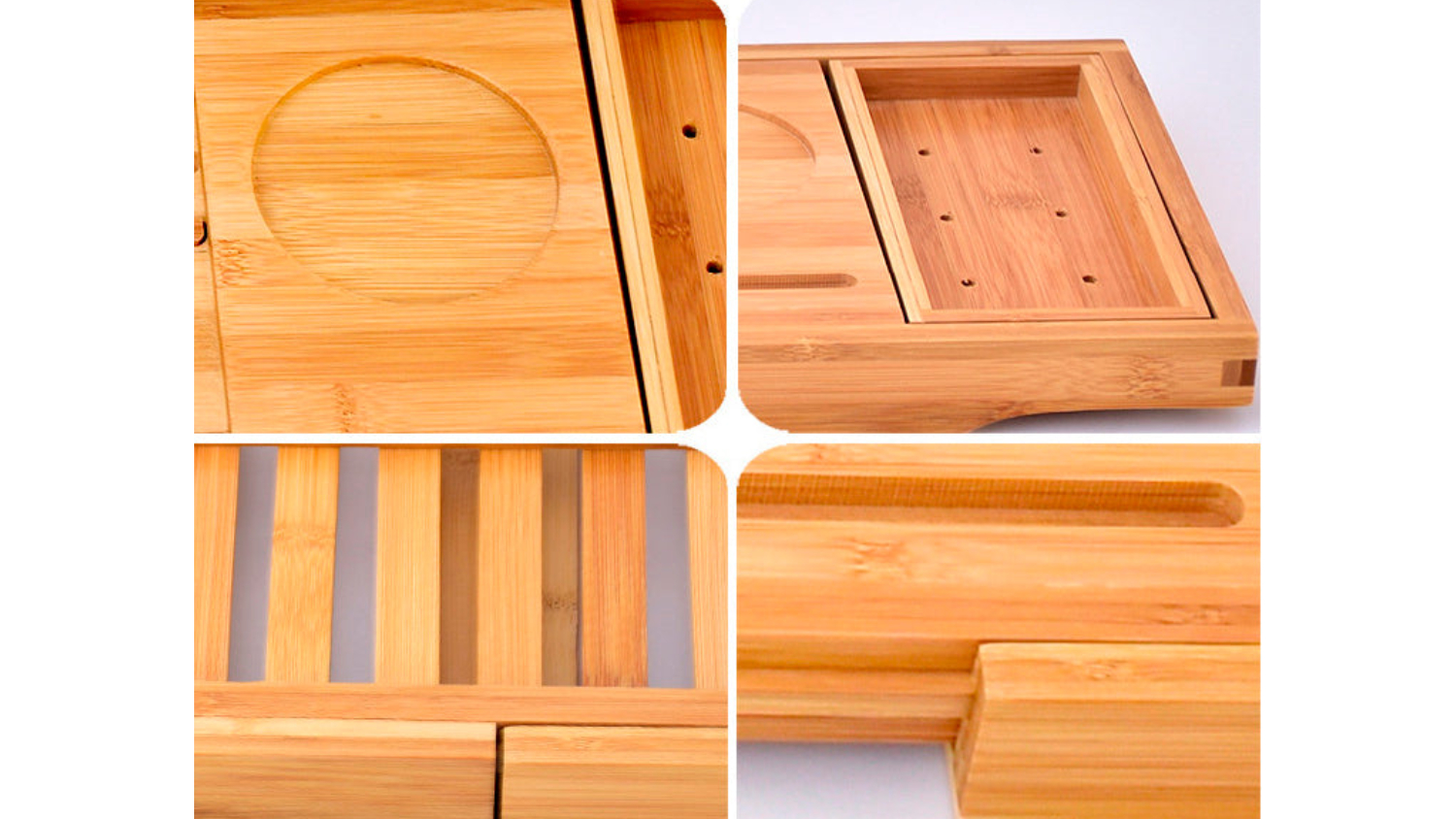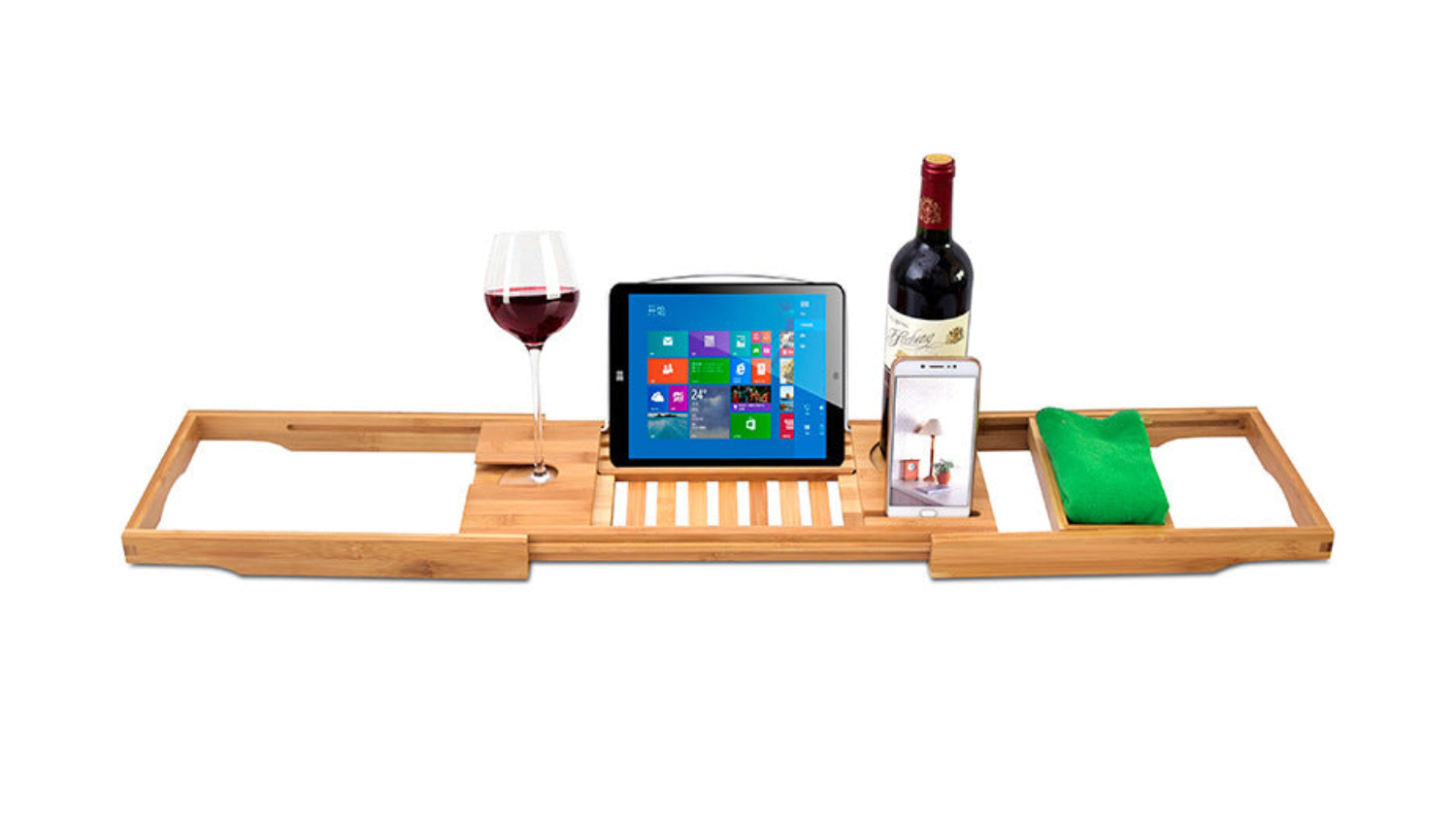 Say goodbye to clutter and hello to comfort. The Kmall Bamboo Bathtub Caddy Tray fits any tub and keeps your essentials like candles and wash products neatly organised. Enjoy a cup of tea or wine with the built-in holder, and support your book or tablet with adjustable bamboo pegs. Bath time just got better.