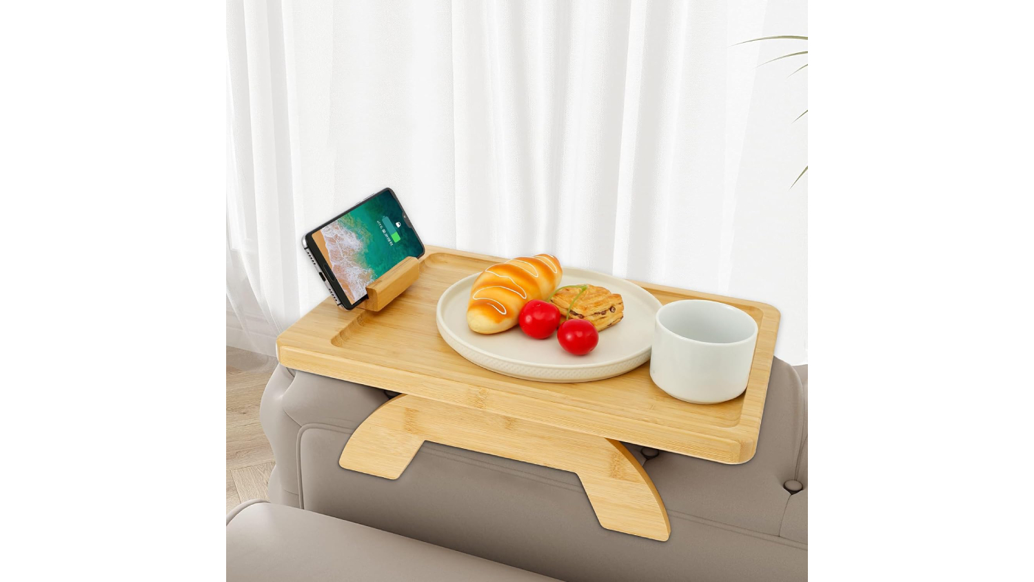 Say goodbye to clutter and hello to comfort with the Kmall Bamboo Couch Arm Table. Designed for ultimate convenience, this tray features a rotating phone holder for hands-free viewing and a secure spring-back hinge to keep your drinks steady. Whether it’s coffee, snacks, or your remote, everything stays within reach!