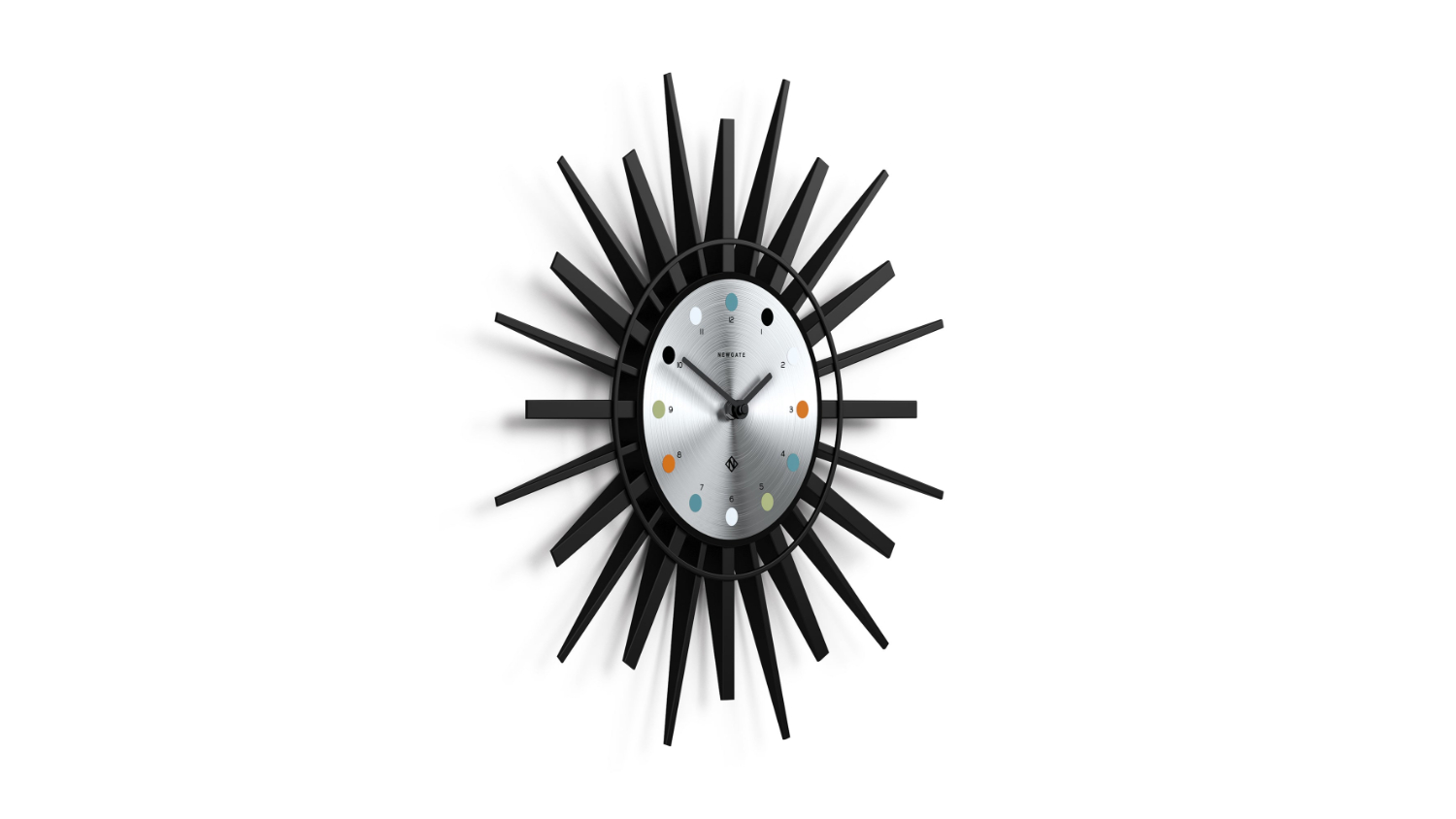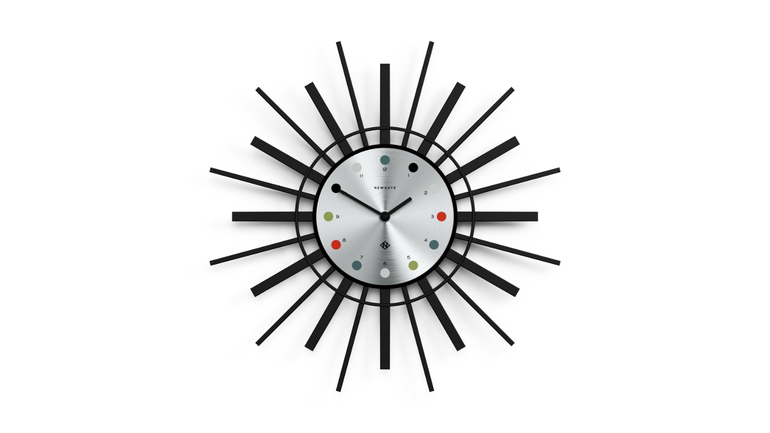 Add more style to your space with the Newgate "Stingray" Wall Clock! This nifty decor boasts striking black sunrays and spun aluminium dial, capturing anyone’s attention from every angle. It also highlights a "silent sweep" movement, providing continuous, fluid motion of the hands—all while creating an ambience of calm sophistication without the audible ticking.