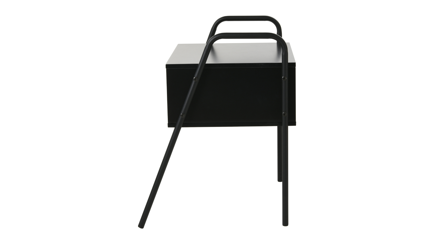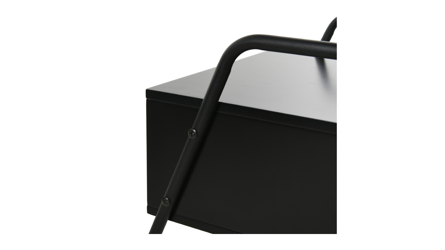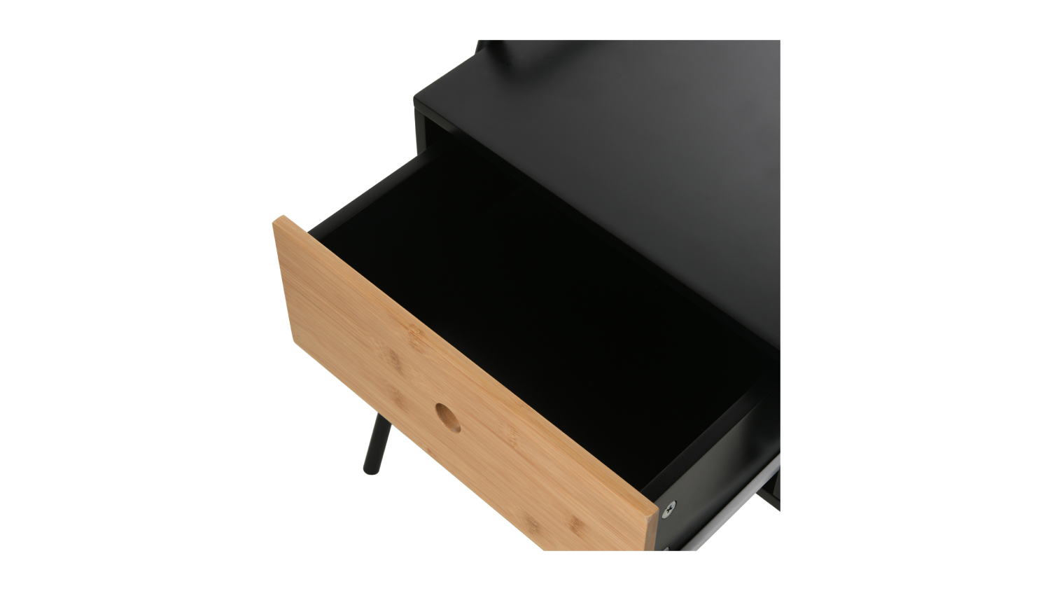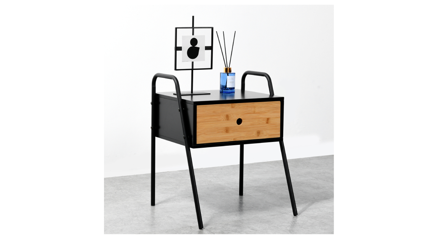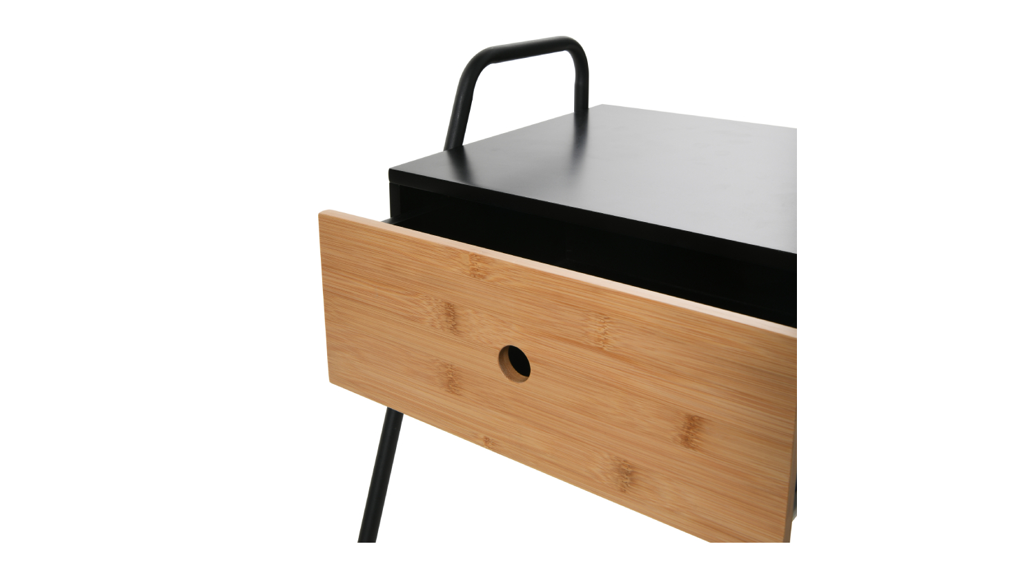 Level up your bedroom style with the Sherwood Oliver Modern Bedside Table - a seamless blend of sleek lines and contrasting tones. Crafted with precision, this table showcases a perfect blend of natural bamboo and sleek black surfaces. The metal frame ensures durability, while the handles and sloping front legs exude sophistication.