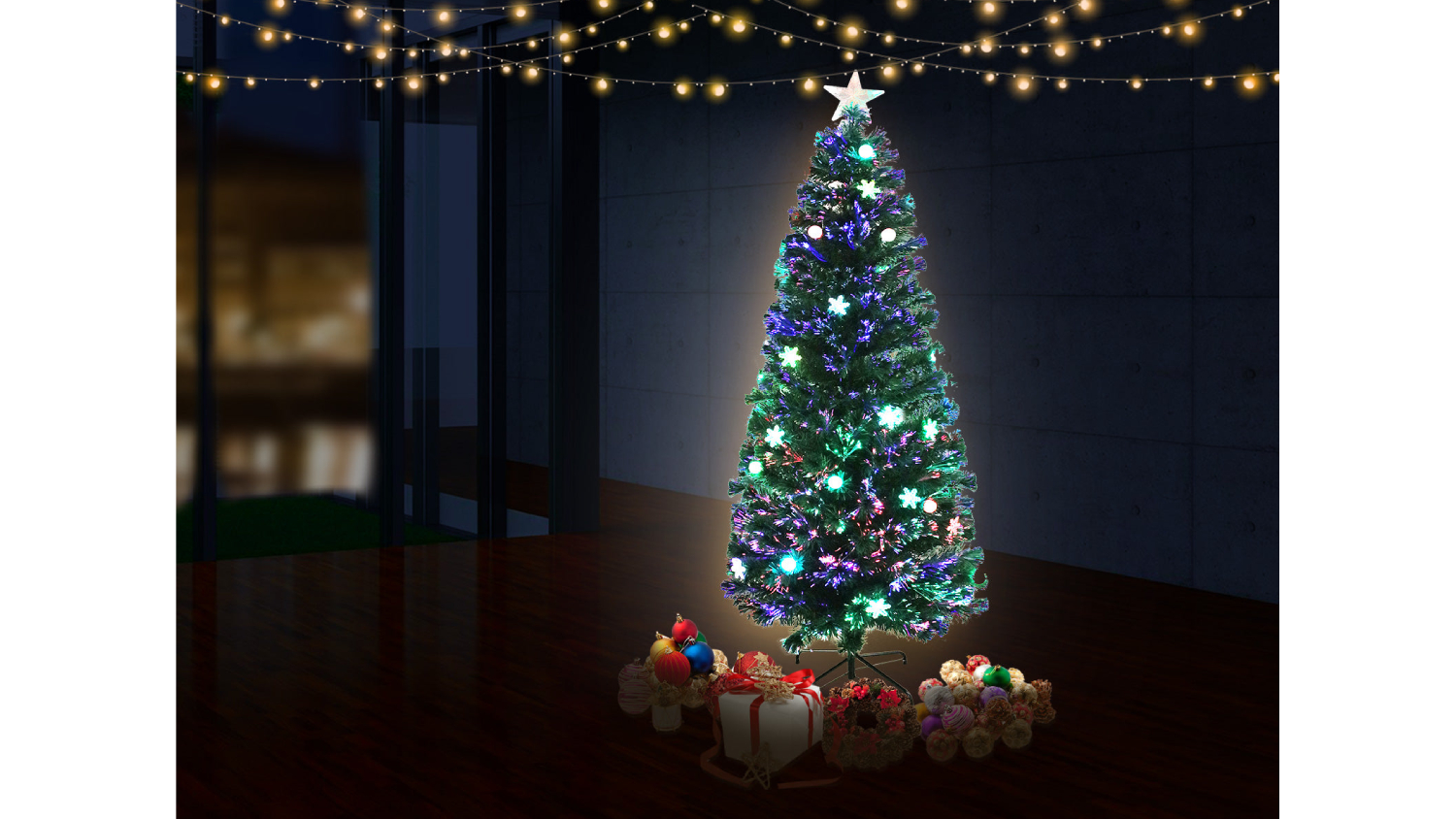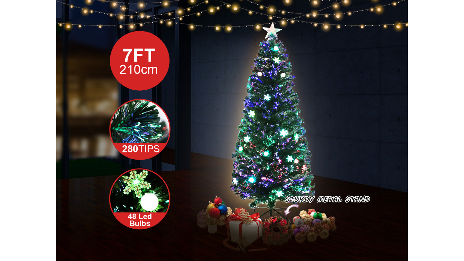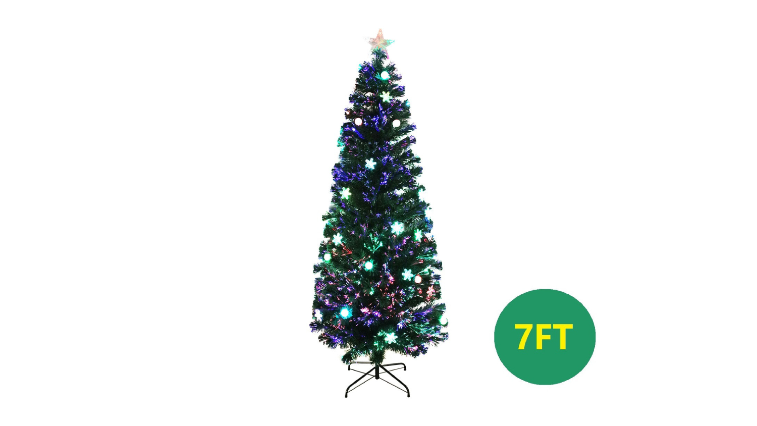 Add a sparkle to your holidays with the TSB Living Faux Christmas Tree! Standing 210cm tall, this tree features brilliant optic fibre lighting with balls, snows, and a dazzling LED star at the top. Crafted from high-quality PVC and featuring a robust metal stand, it combines durability with festive charm. Now you can create a spectacular display for the yuletide season!