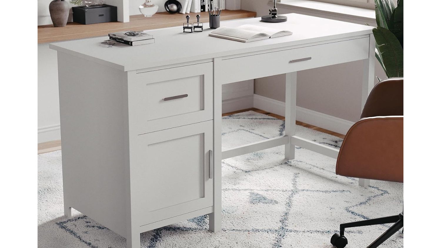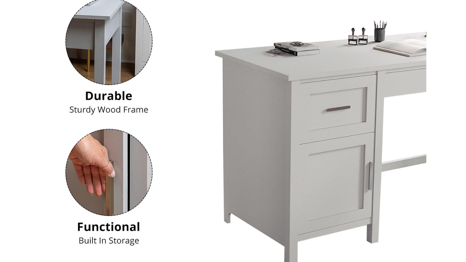 Upgrade your workspace with the TSB Living Home Office Desk with Cabinet! Featuring a sleek grey finish and stylish hardware, this unit blends timeless elegance with modern functionality. With two drawers and a built-in storage cabinet, you’ll have plenty of room to keep your essentials organised. Crafted from a durable wood frame, it’s designed to last while keeping your home office looking chic and clutter-free.