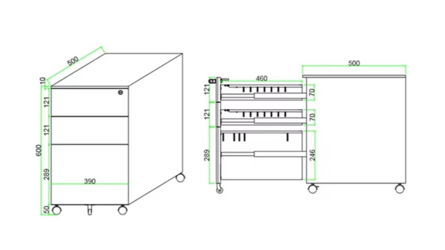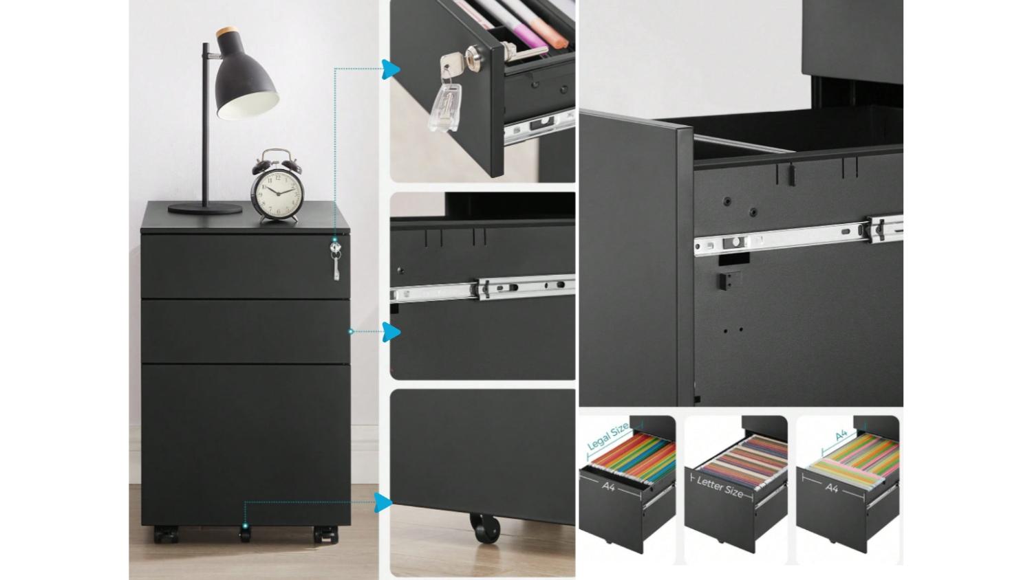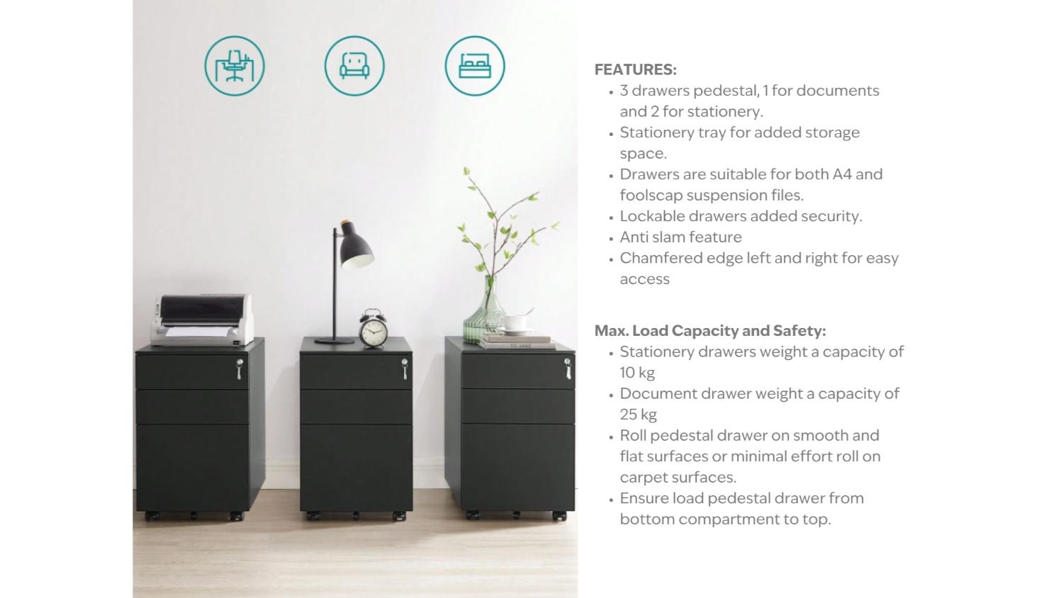 Maximise your workspace with the TSB Living Pedestal Filing Cabinet. This unit offers a full file drawer for legal or letter-size files, two extra drawers for supplies, and a built-in pen tray. Five-wheel casters provide smooth mobility and added stability, while the central locking system with two keys keeps everything secure.