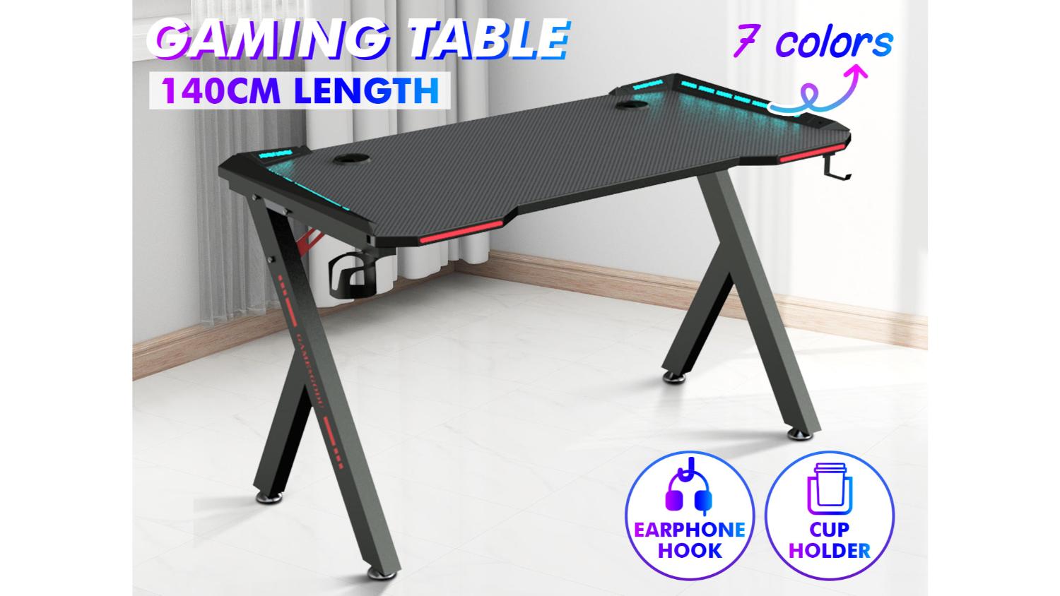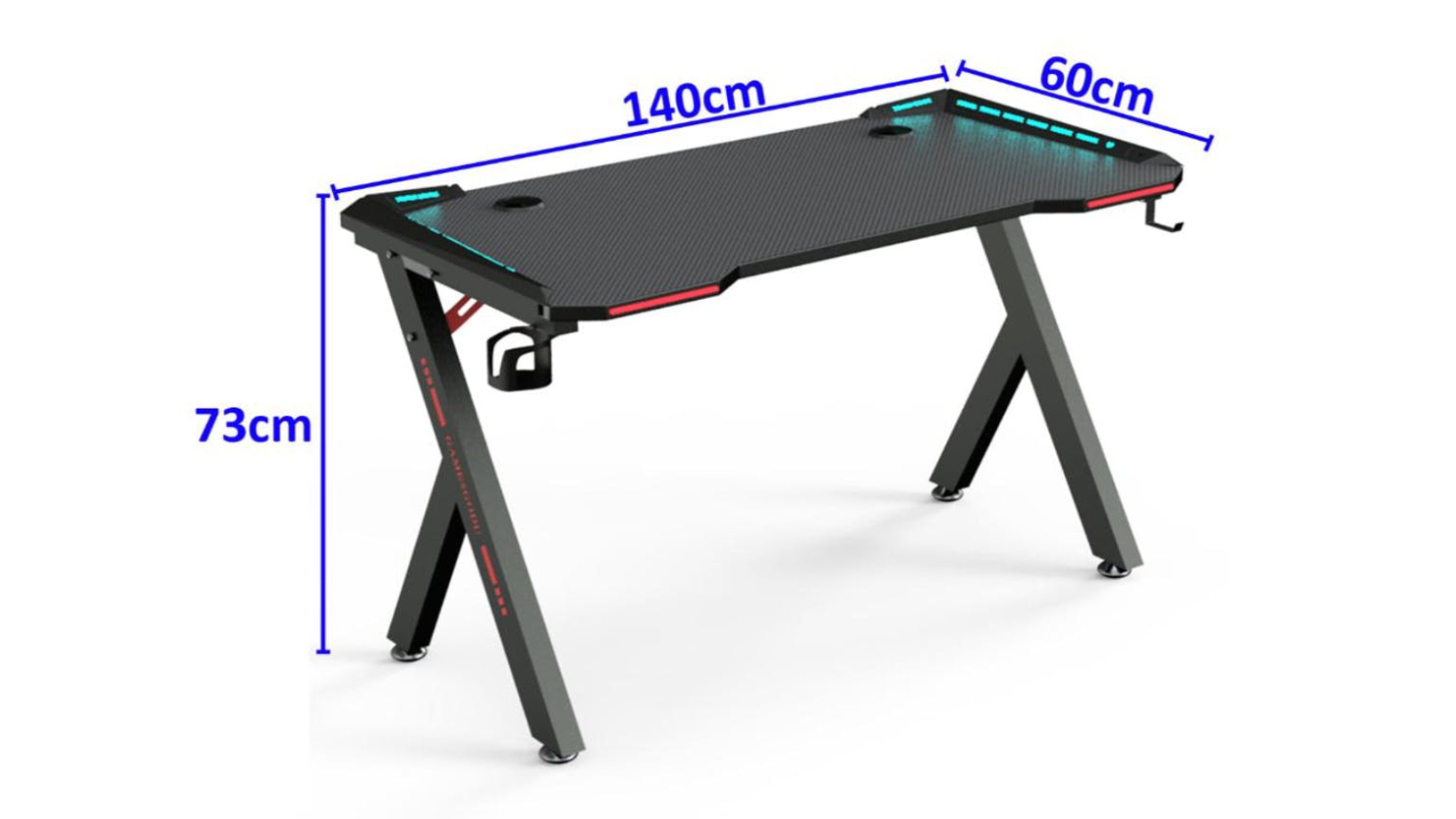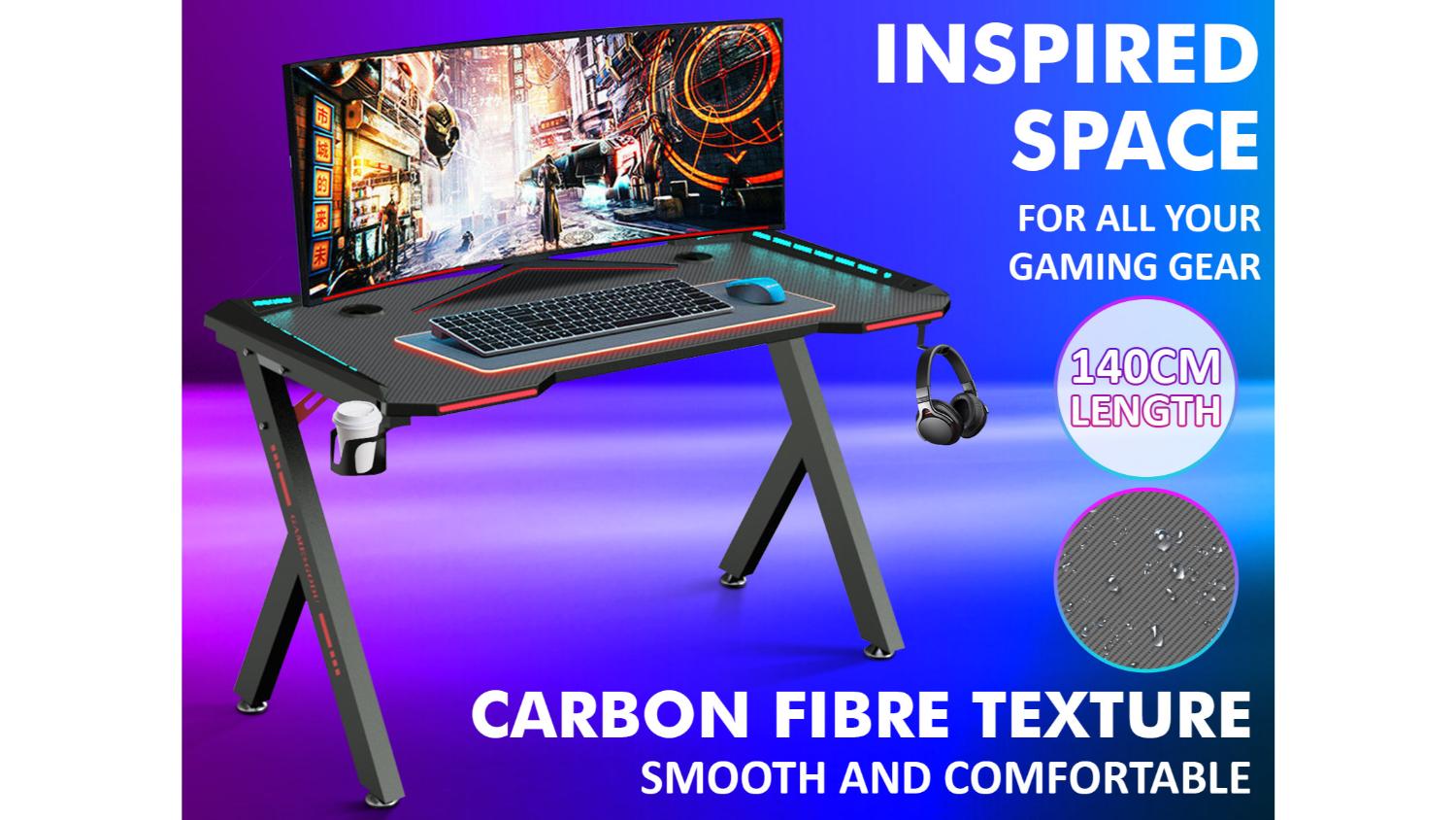 TSB Living R5 Gaming Table with Gamer LEDs, Headphone Hook 140cm - Carbon Fiber Texture