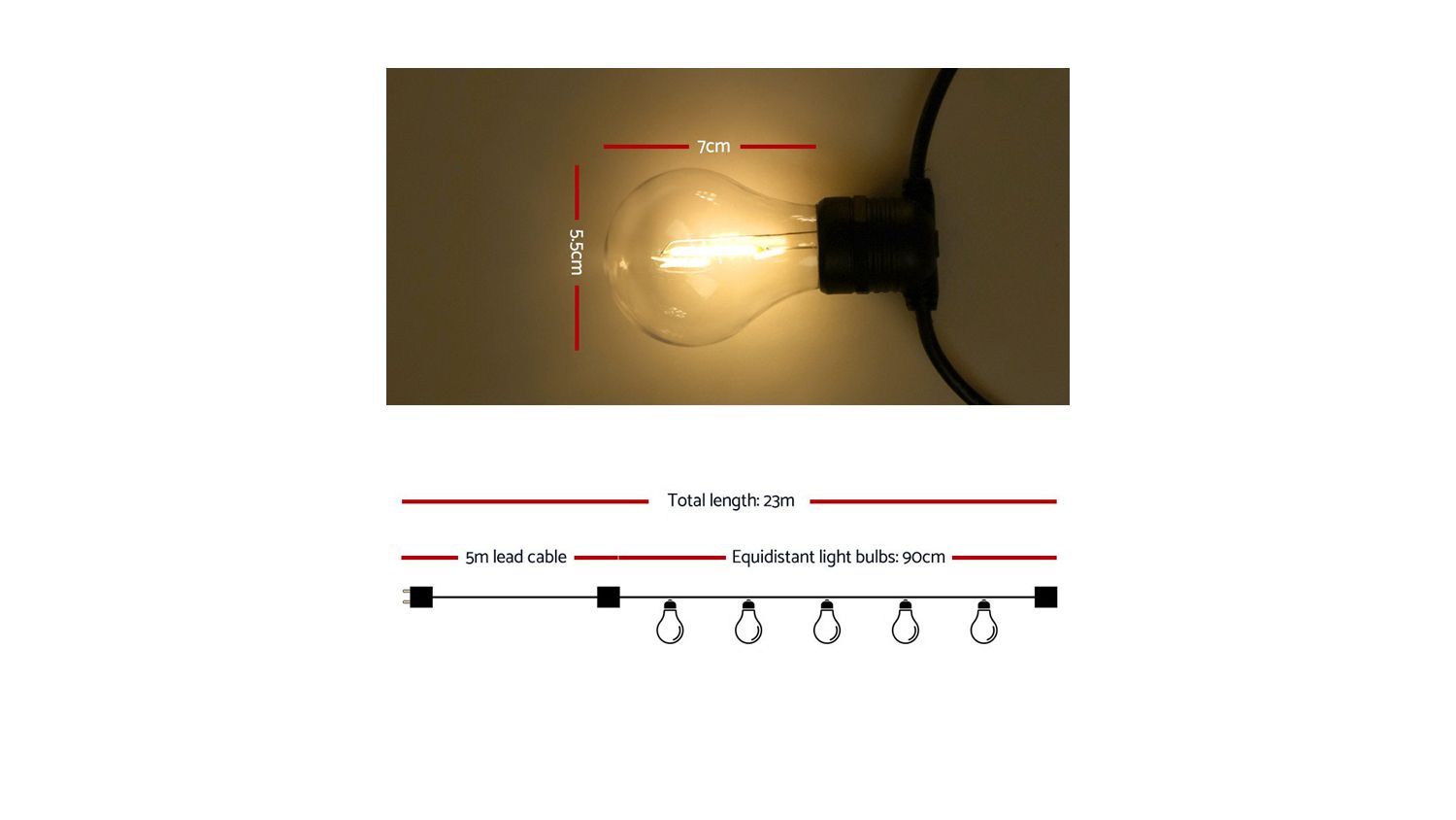 Create a very warm and inviting ambience for any occasion with the Jingle Jollys String A19 Lights 23m! This string of lights is suitable for indoor and outdoor use, thanks to its reliable IP44 rating that can outlast any weather condition. It can brighten up any birthday party, wedding, or special event with its stunning and mellow glow. On top of that, each bulb boasts a whopping 20,000 hours of lifespan.