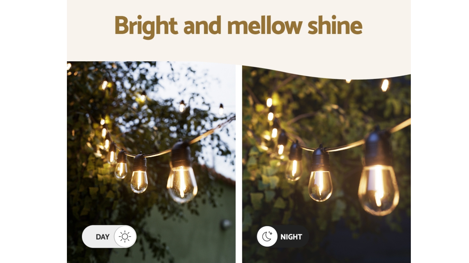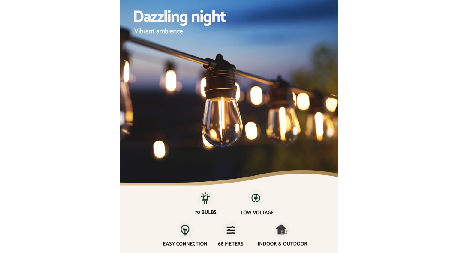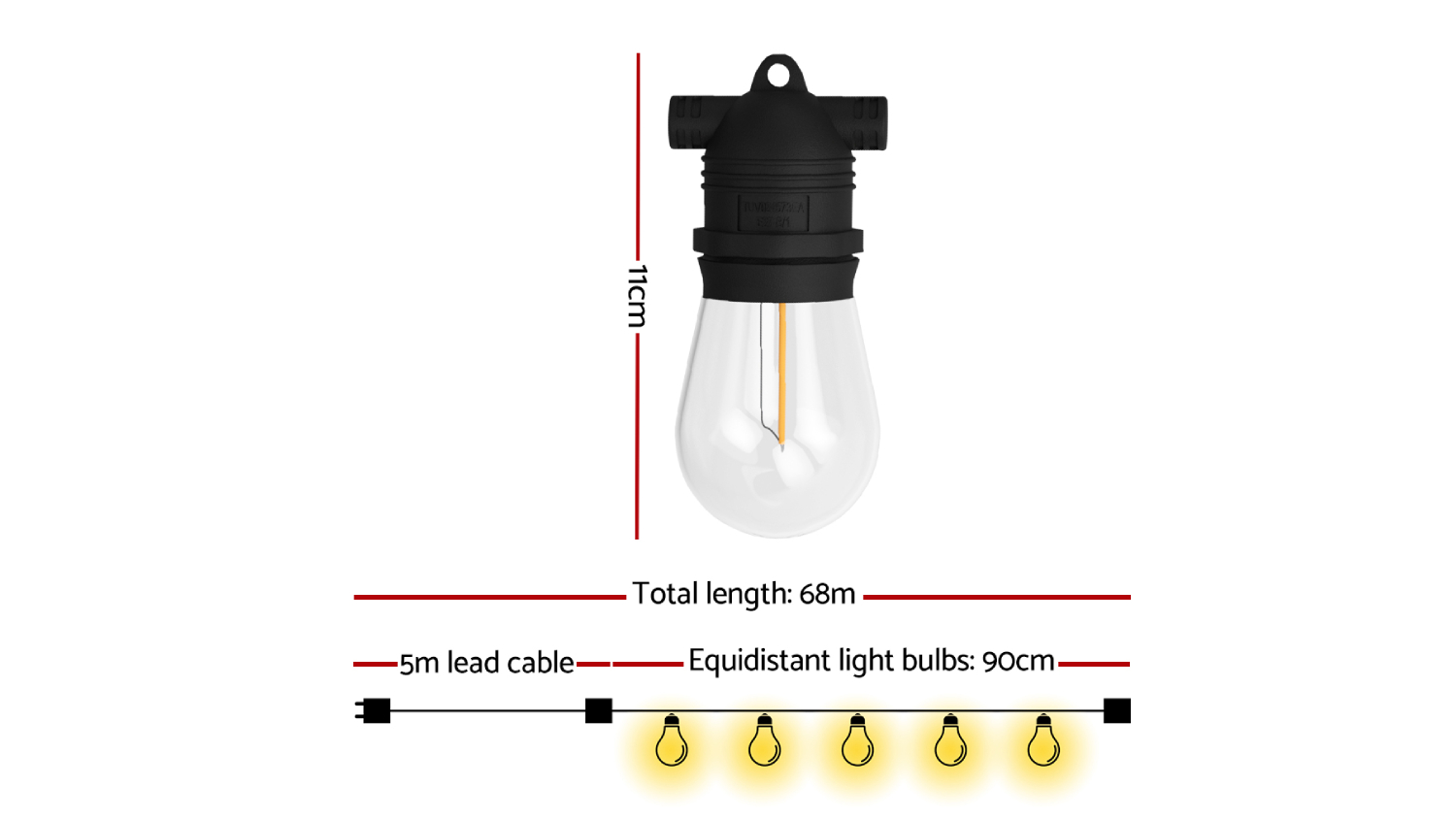 Light up any occasion with these New Aim Outdoor LED S14 String Festoon Lights 68m! Suitable for both indoor and outdoor settings, these ultra-bright lights are perfect for any celebration throughout the year. It stretches up to 68m with evenly spaced bulbs, delivering consistent and dazzling brightness. Whether you're transforming your backyard into a wonderland or adding festive cheer indoors, these fairy lights are sure to enchant you.