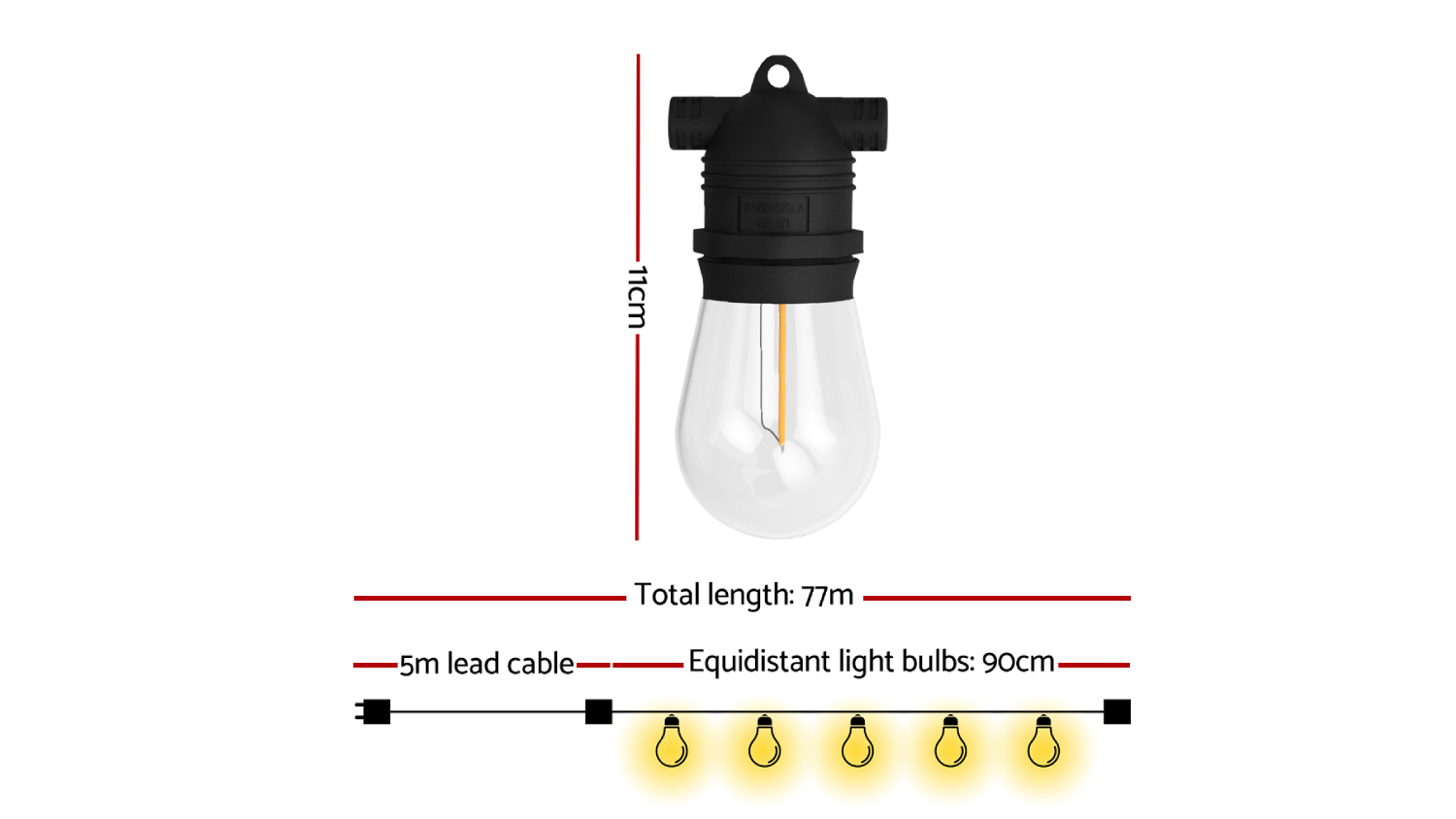 Light up any occasion with these New Aim Outdoor LED S14 String Festoon Lights 77m! Suitable for both indoor and outdoor settings, these ultra-bright lights are perfect for any celebration throughout the year. It stretches up to 77m with evenly spaced bulbs, delivering consistent and dazzling brightness. Whether you're transforming your backyard into a wonderland or adding festive cheer indoors, these fairy lights are sure to enchant you.