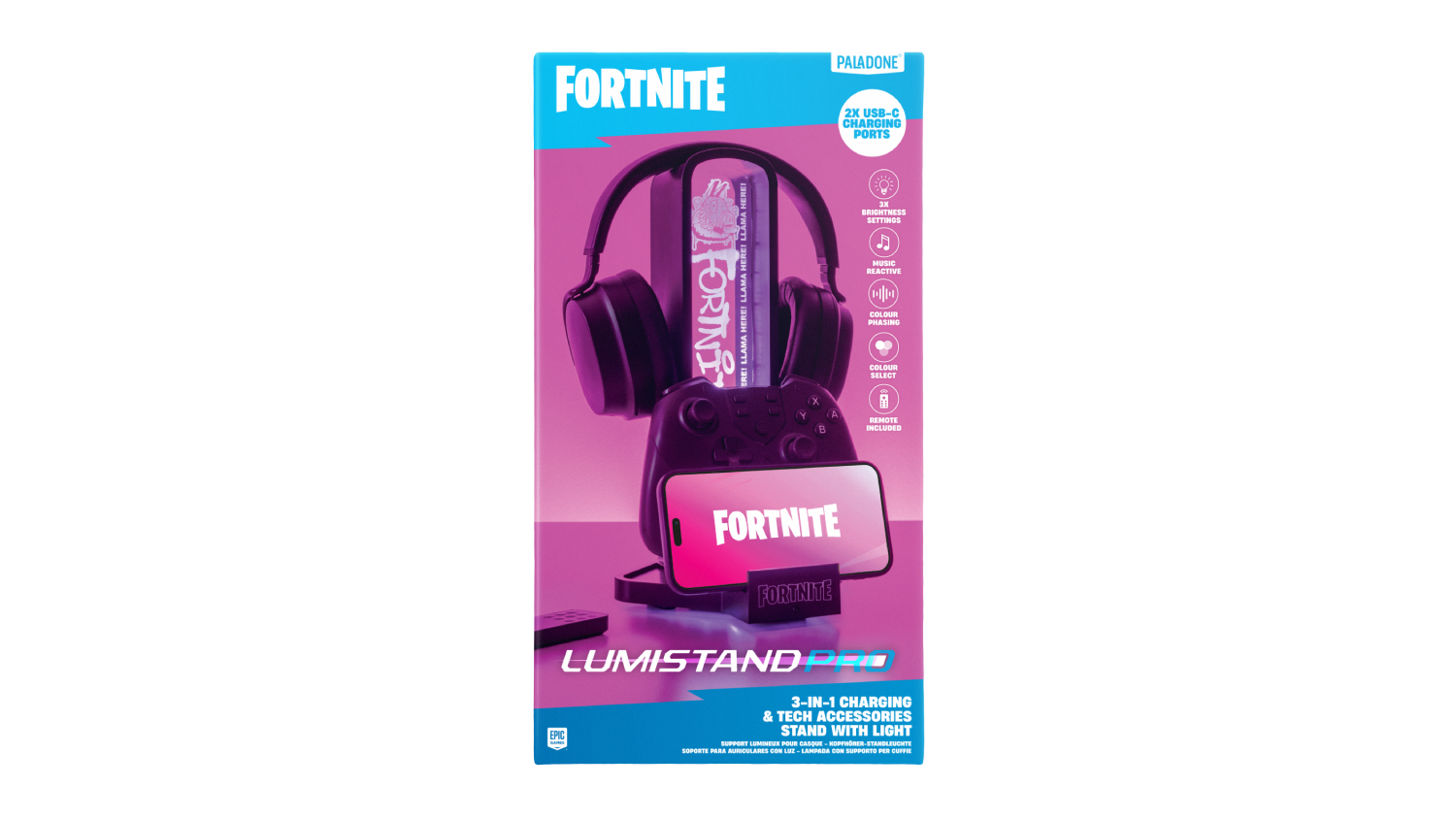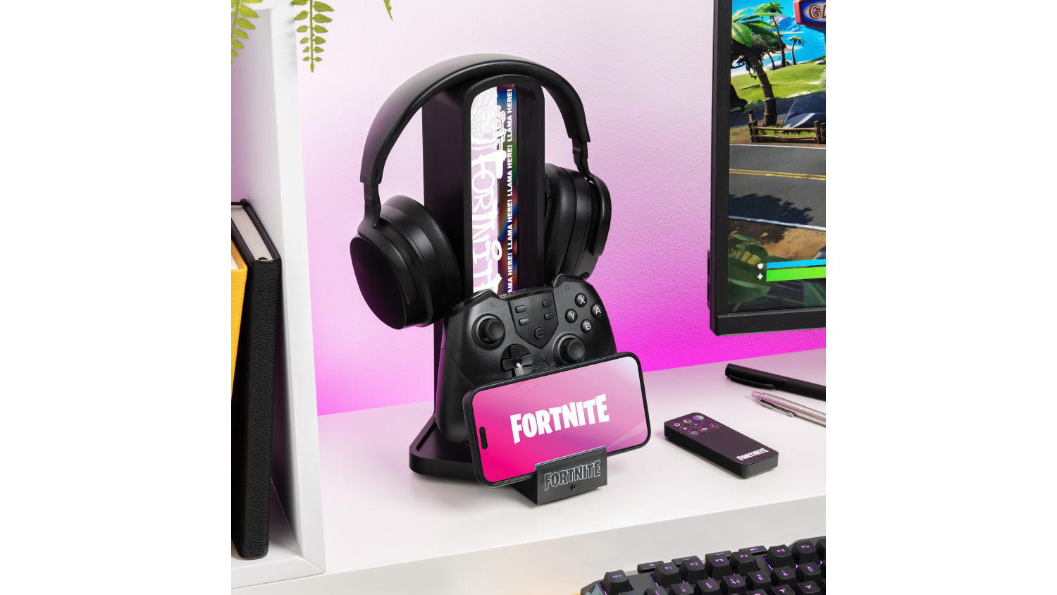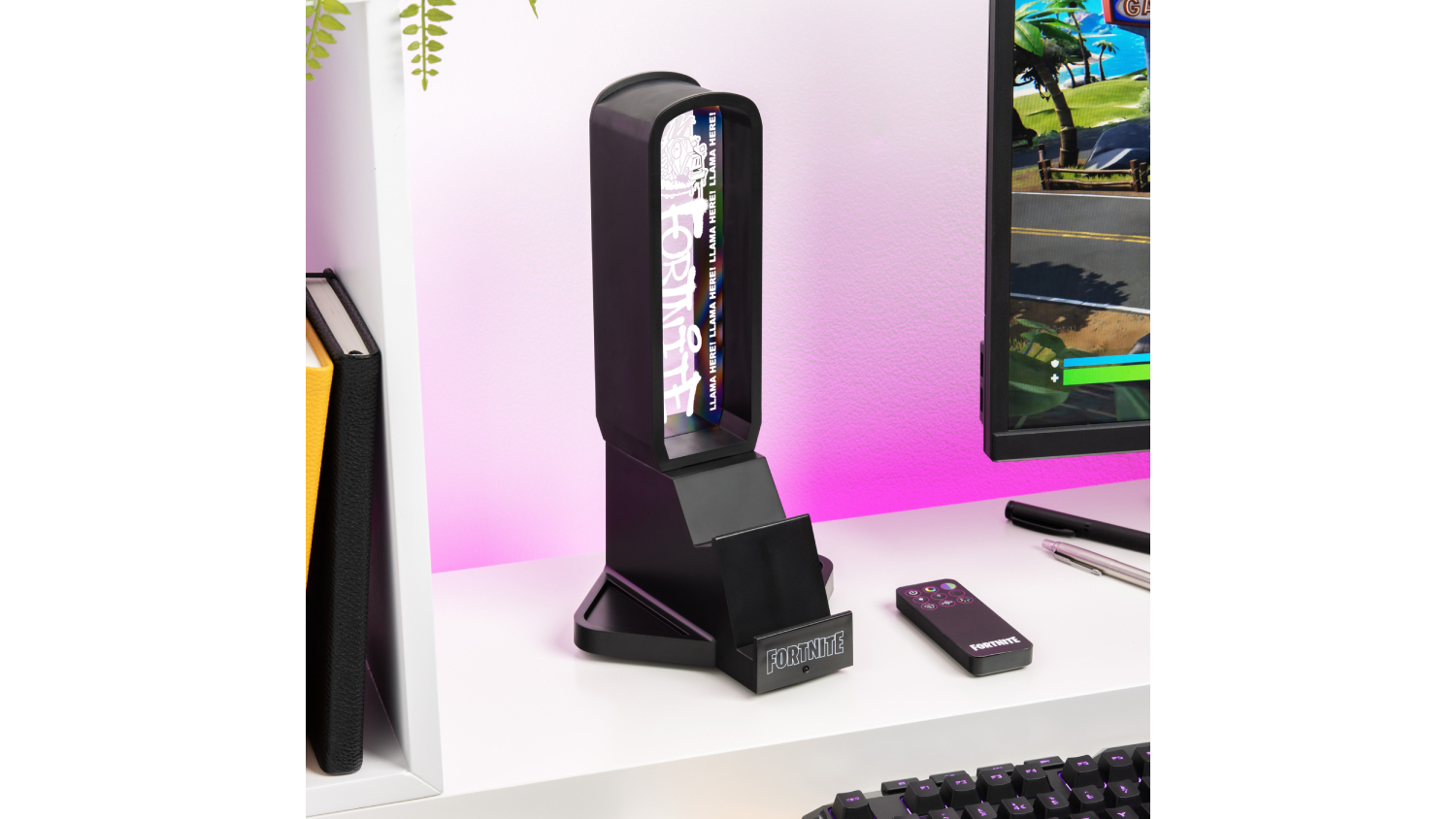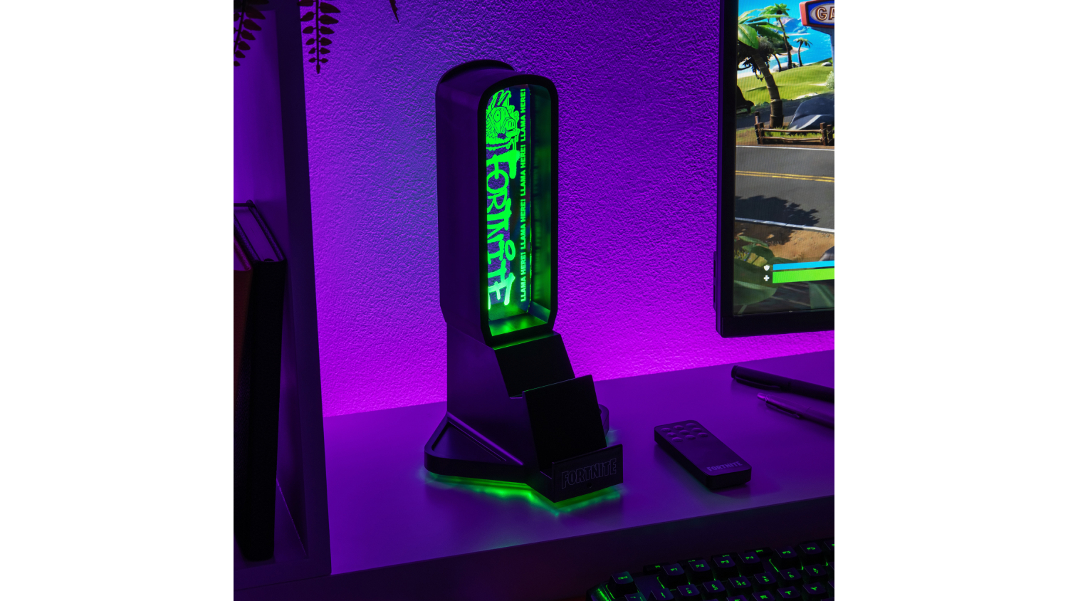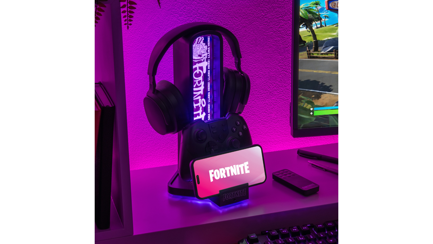 Upgrade your gaming setup and keep your gear organised with the Officially Licensed Paladone Desktop LED Headphone Stand - Fortnite. This versatile stand holds your headset, controller, or phone, all while adding a colourful glow to your rig. It features 3 brightness settings, colour-changing lights, and a music-reactive mode, perfect for creating the right mood.