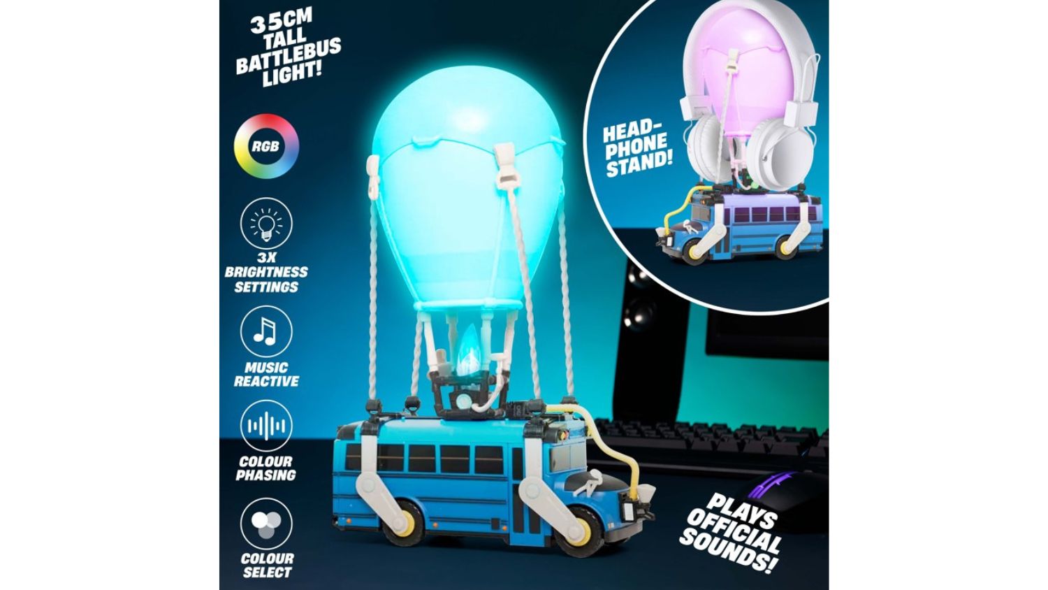 The Paladone Diorama Desk Light featuring Battle Bus stands 32 cm tall and doubles as a convenient headphone stand. It brings the game to life with immersive music, reactive, and colour-phasing modes. Powered via a direct USB cable, this officially licensed diorama is a must-have accessory and a perfect gift for any Fortnite fan or collector.