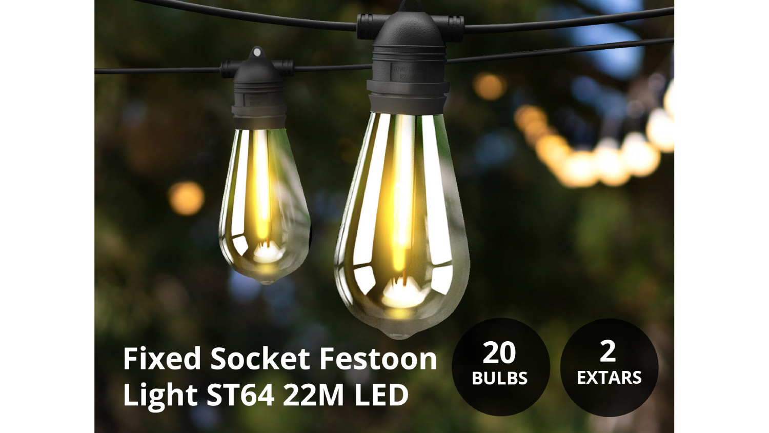Transform any space into a magical wonderland with the TSB Living Fixed Socket LED Festoon Light String ST64 11W 22m. These stunning lights are perfect for any celebration, creating a warm, inviting ambience with a beautiful mellow glow. Built to last, with waterproof (IP65) construction and low energy consumption, these lights can be used indoors or in protected outdoor areas.