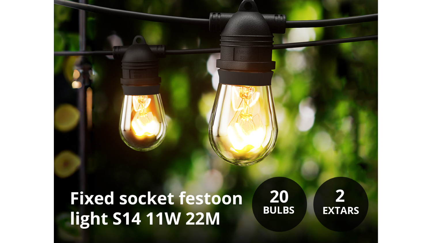 Transform any space into a dazzling haven with the TSB Living Fixed Socket Tungsten Festoon Light String S14 11W. This 22m string of lights features warm white bulbs spaced for consistent illumination. With low energy consumption, quick setup and an IP65 waterproof rating, it's perfect for festive décor all year round!