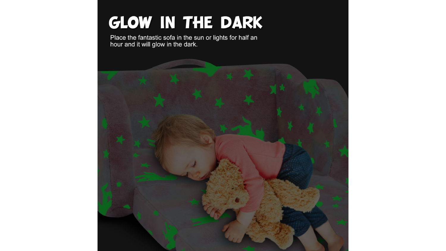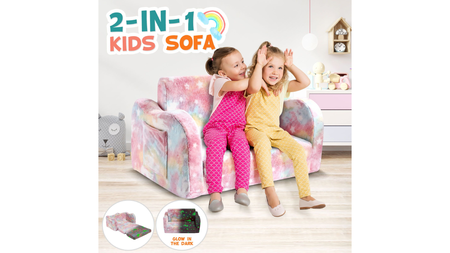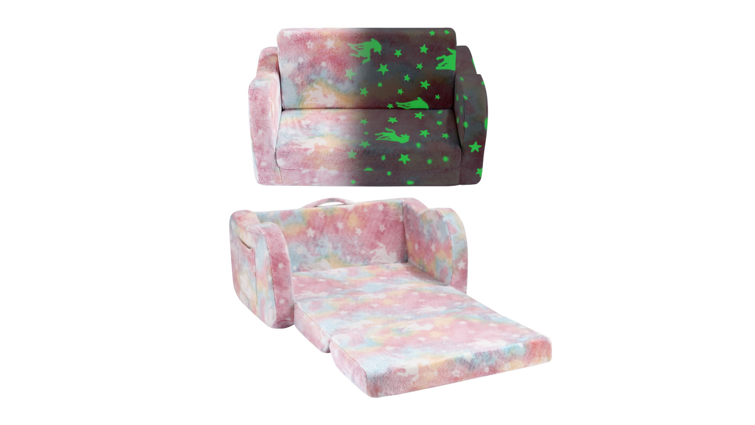 The Kidbot 2-in-1 Flip-Out Children's Sofa is the perfect little spot for reading, relaxing, or imaginative play—easily flipping out into a comfy bed whenever your child wants to stretch out. Made with high‑density sponge and a durable outer cover, it’s designed to handle hours of lounging and giggles. Parents will love the machine‑washable cover for quick cleanups, while kids will be obsessed with its magical glow‑in‑the‑dark feature. With handy side pockets for books and small treasures, this kids' sofa brings both fun and functionality to any bedroom or playroom.