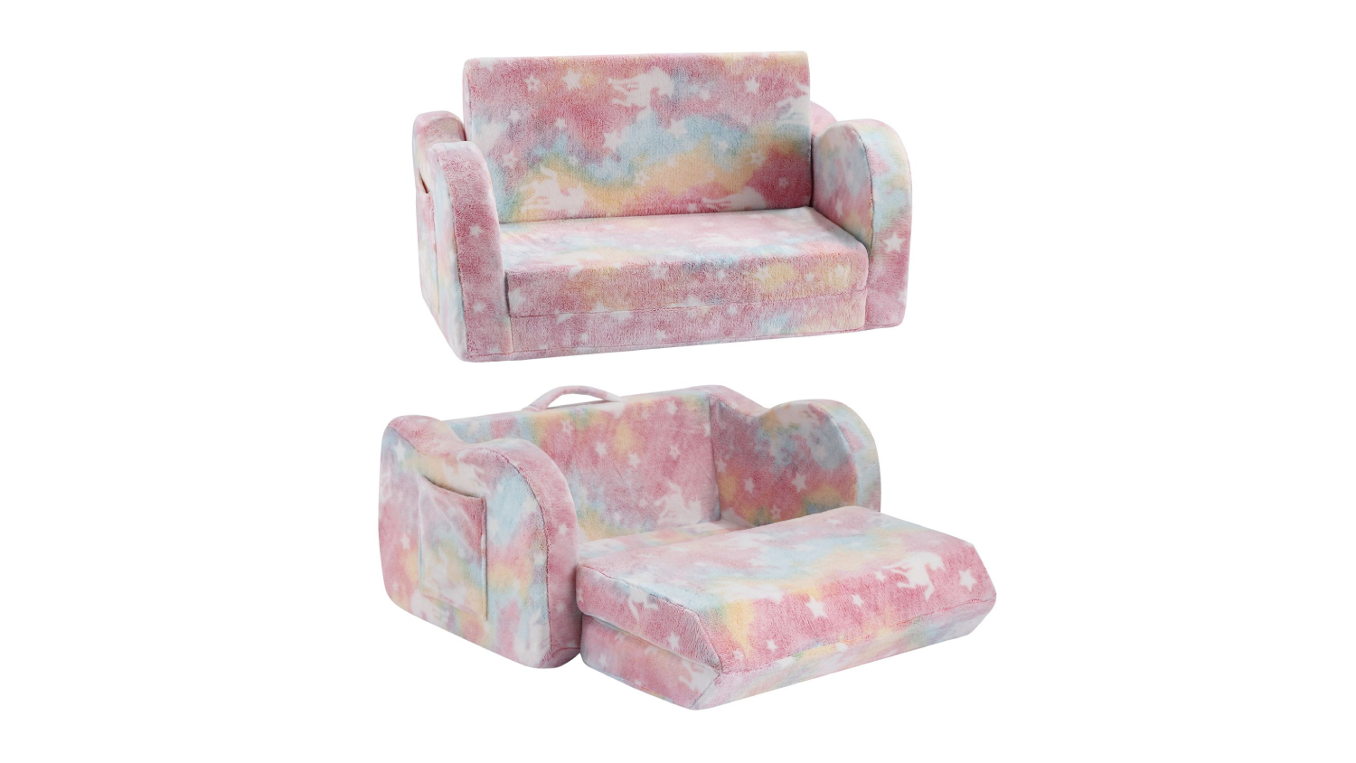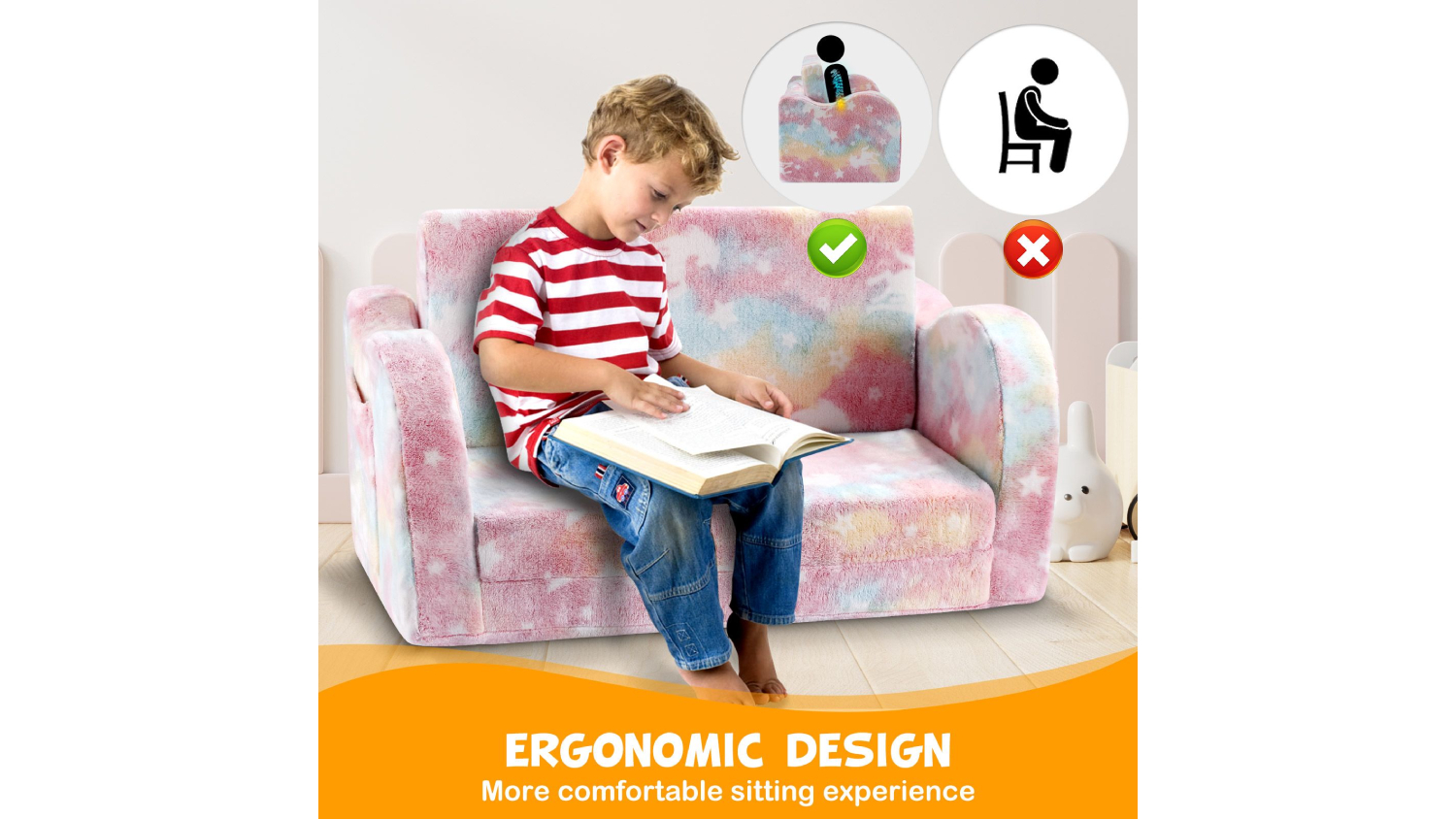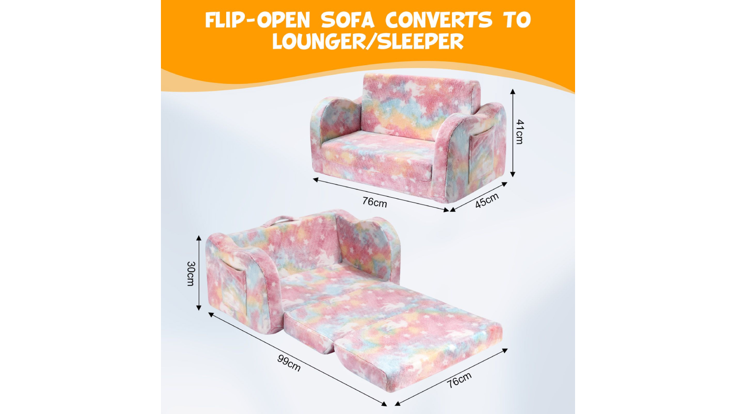 The Kidbot 2-in-1 Flip-Out Children's Sofa is the perfect little spot for reading, relaxing, or imaginative play—easily flipping out into a comfy bed whenever your child wants to stretch out. Made with high‑density sponge and a durable outer cover, it’s designed to handle hours of lounging and giggles. Parents will love the machine‑washable cover for quick cleanups, while kids will be obsessed with its magical glow‑in‑the‑dark feature. With handy side pockets for books and small treasures, this kids' sofa brings both fun and functionality to any bedroom or playroom.