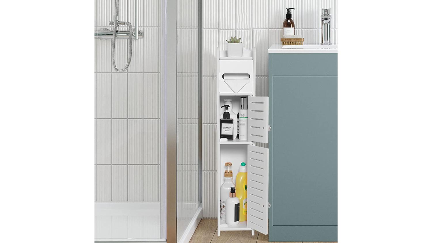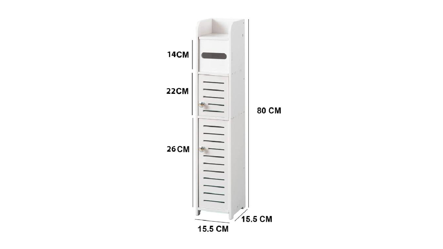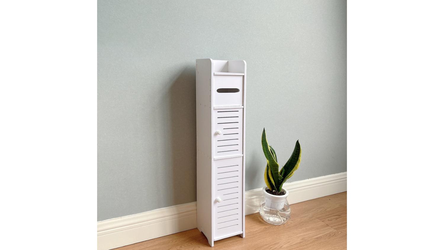 Maximise your bathroom storage potential with the Kmall Tall Compact Slatted Cabinet 15.5 x 80cm! This space-saving wonder fits perfectly in corners, offering ample storage for toiletries and even holding 4-5 rolls of toilet paper. The open shelves keep essentials handy, while the top shelf is perfect for a pop of greenery or your phone. Made from eco-friendly, waterproof PVC, it's lightweight, easy to clean, and ideal for small spaces!