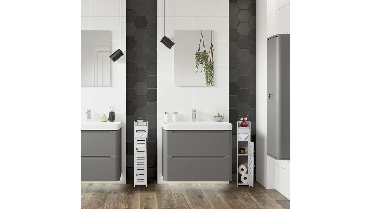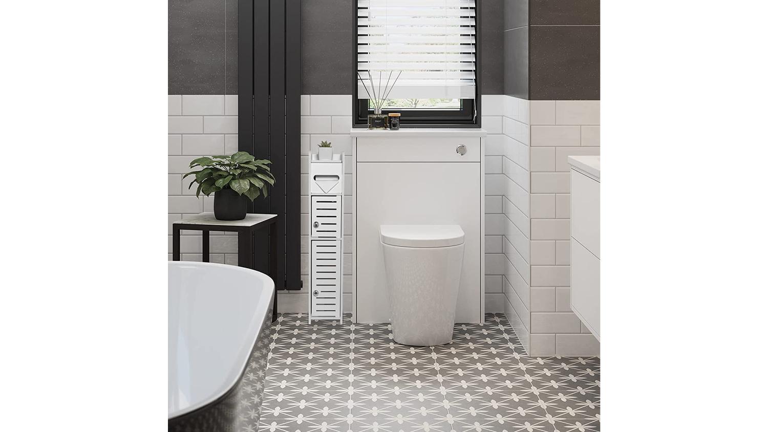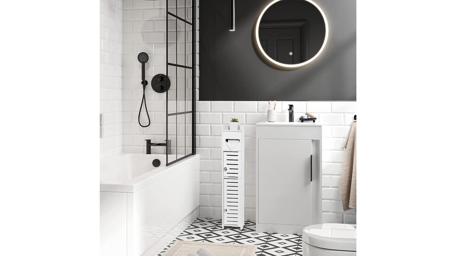 Maximise your bathroom storage potential with the Kmall Tall Compact Slatted Cabinet 15.5 x 80cm! This space-saving wonder fits perfectly in corners, offering ample storage for toiletries and even holding 4-5 rolls of toilet paper. The open shelves keep essentials handy, while the top shelf is perfect for a pop of greenery or your phone. Made from eco-friendly, waterproof PVC, it's lightweight, easy to clean, and ideal for small spaces!
