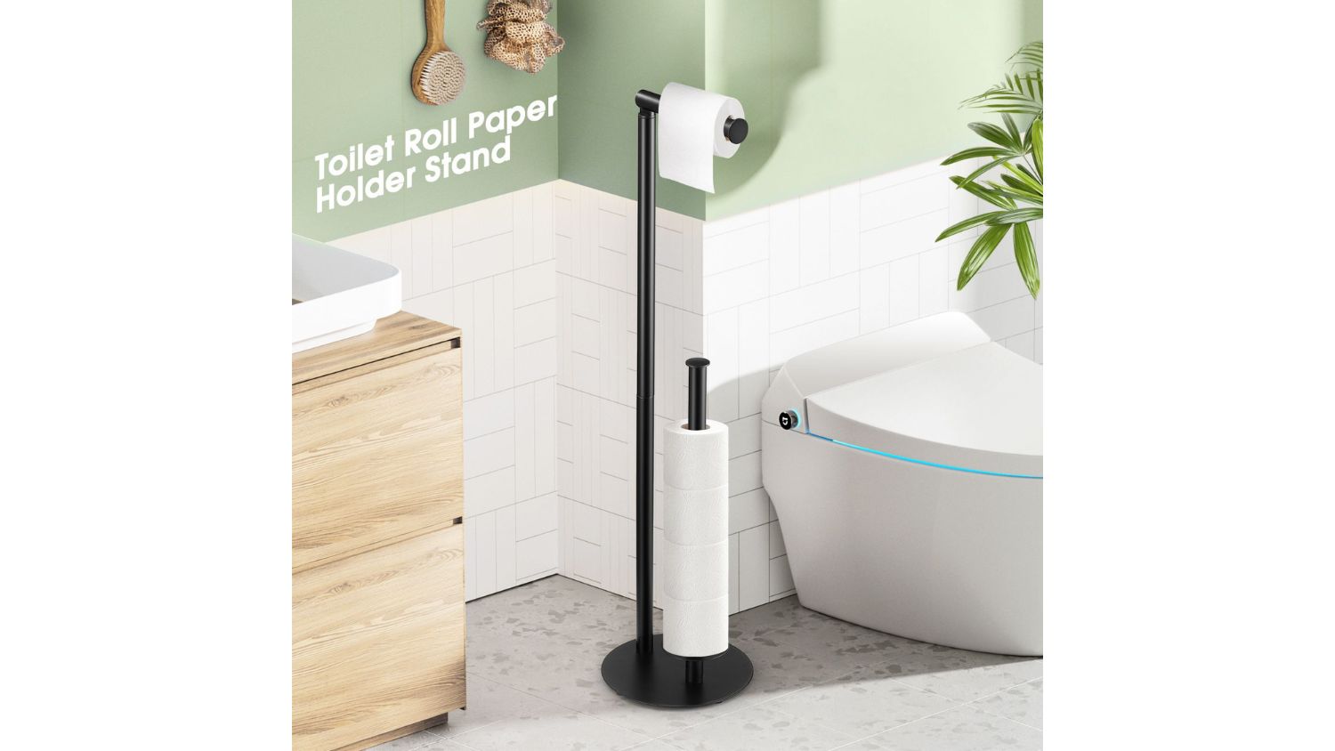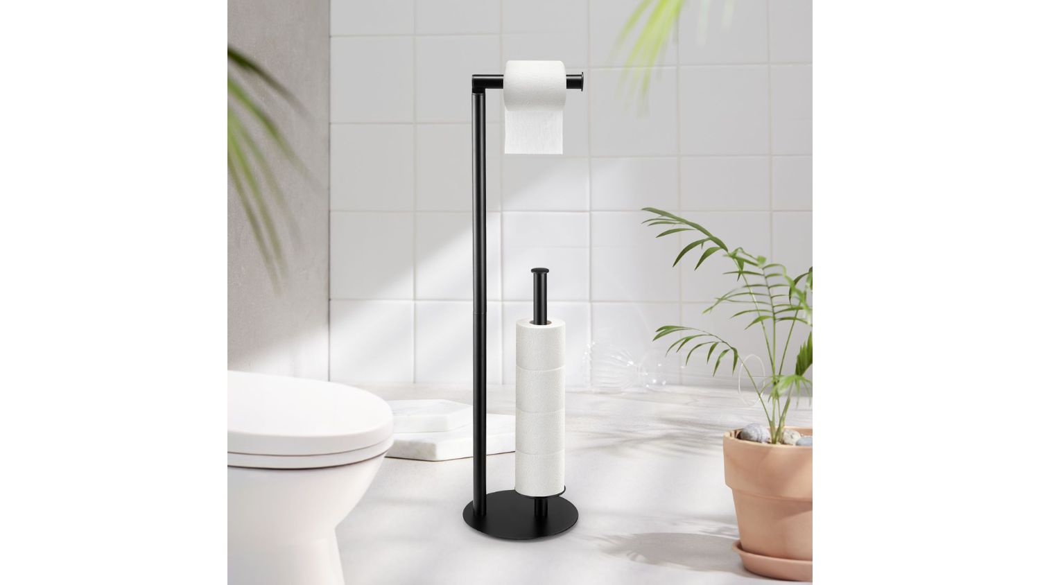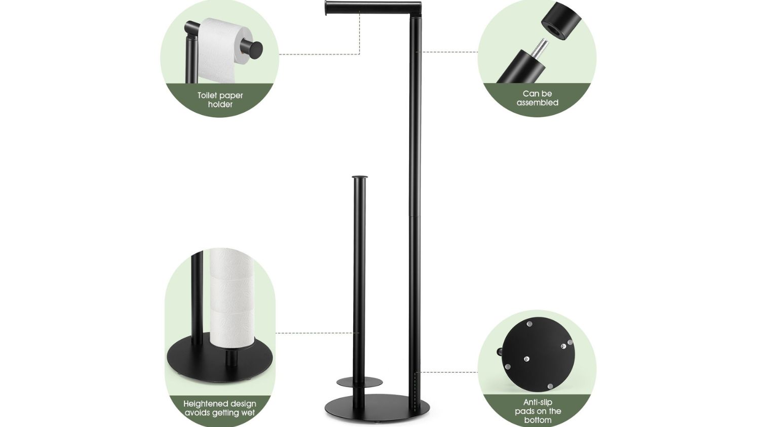 Keep your bathroom and kitchen organised with the Luxsuite Toilet Paper Holder. This freestanding holder gives your toilet rolls the perfect place to hang and store. Made from high-quality metal with a smooth black finish, it’s fully waterproof and rustproof. The steady base and anti-slip rubber pads also prevent sliding, while the vertical pole keeps spare rolls close and tidy.
