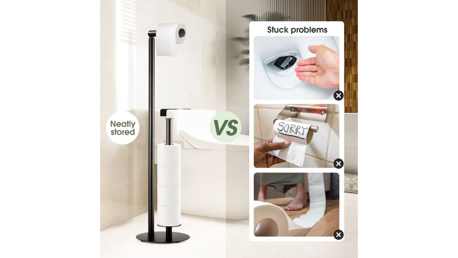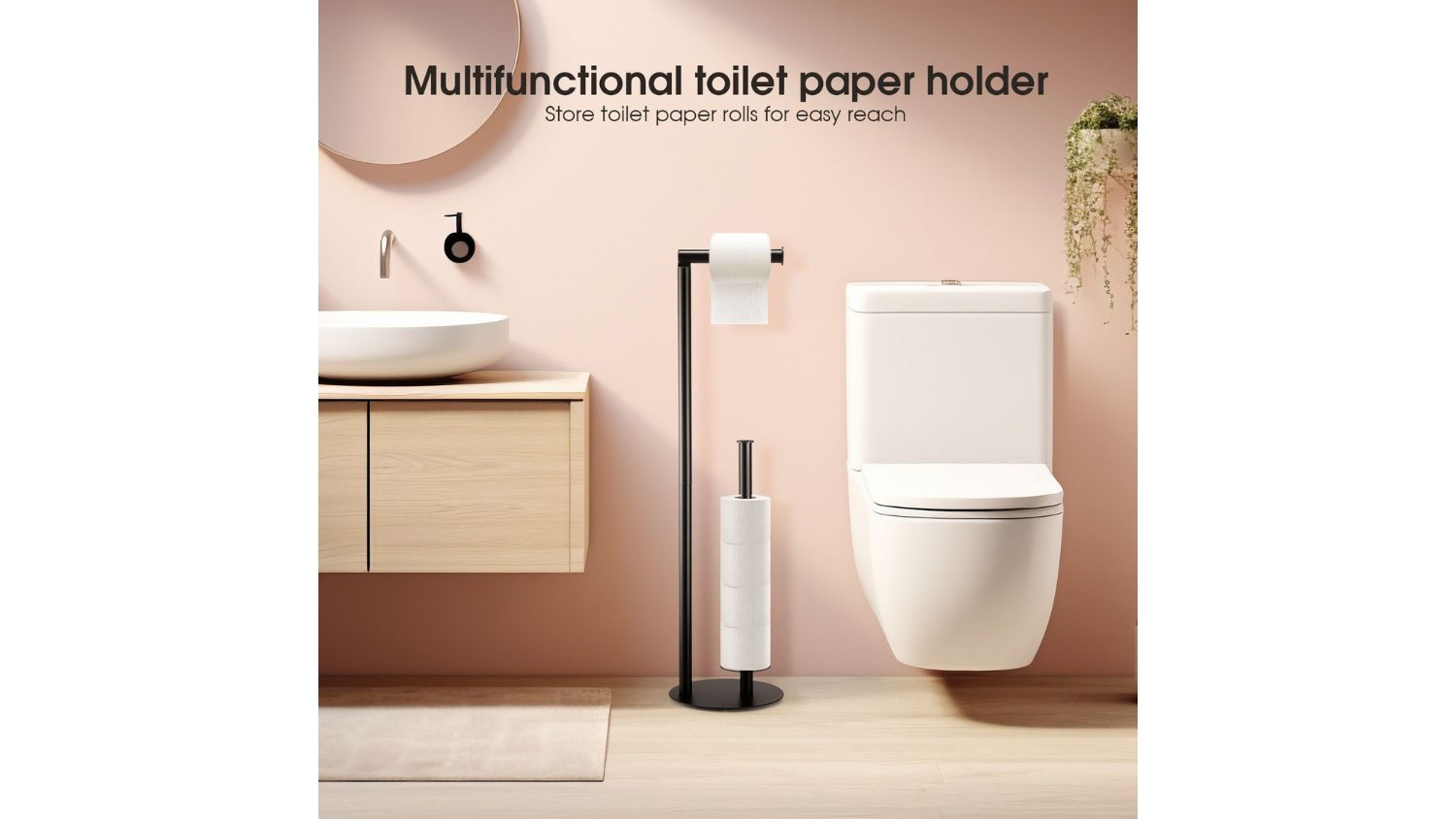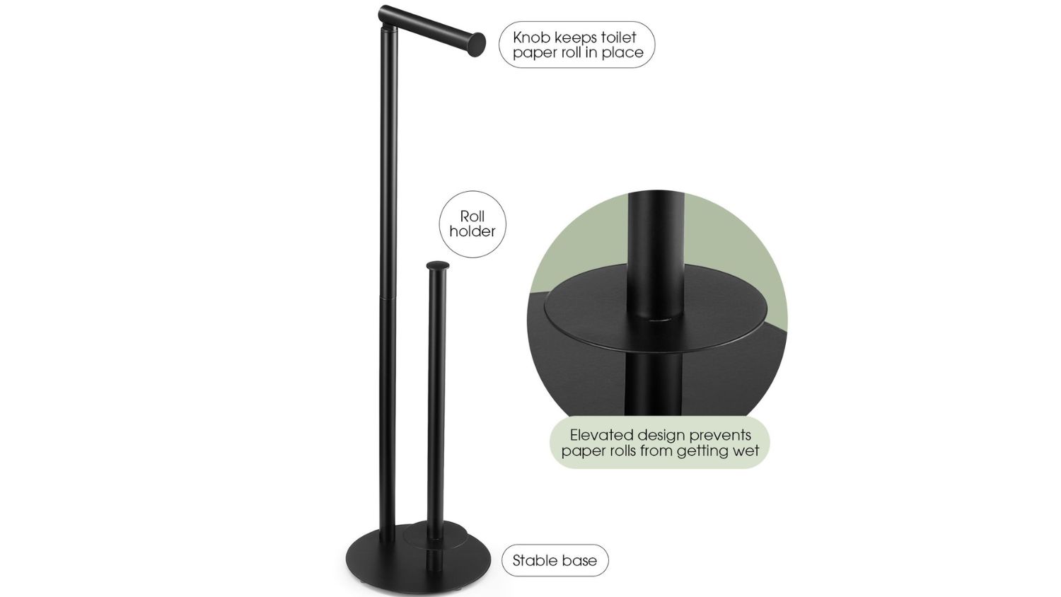 Keep your bathroom and kitchen organised with the Luxsuite Toilet Paper Holder. This freestanding holder gives your toilet rolls the perfect place to hang and store. Made from high-quality metal with a smooth black finish, it’s fully waterproof and rustproof. The steady base and anti-slip rubber pads also prevent sliding, while the vertical pole keeps spare rolls close and tidy.
