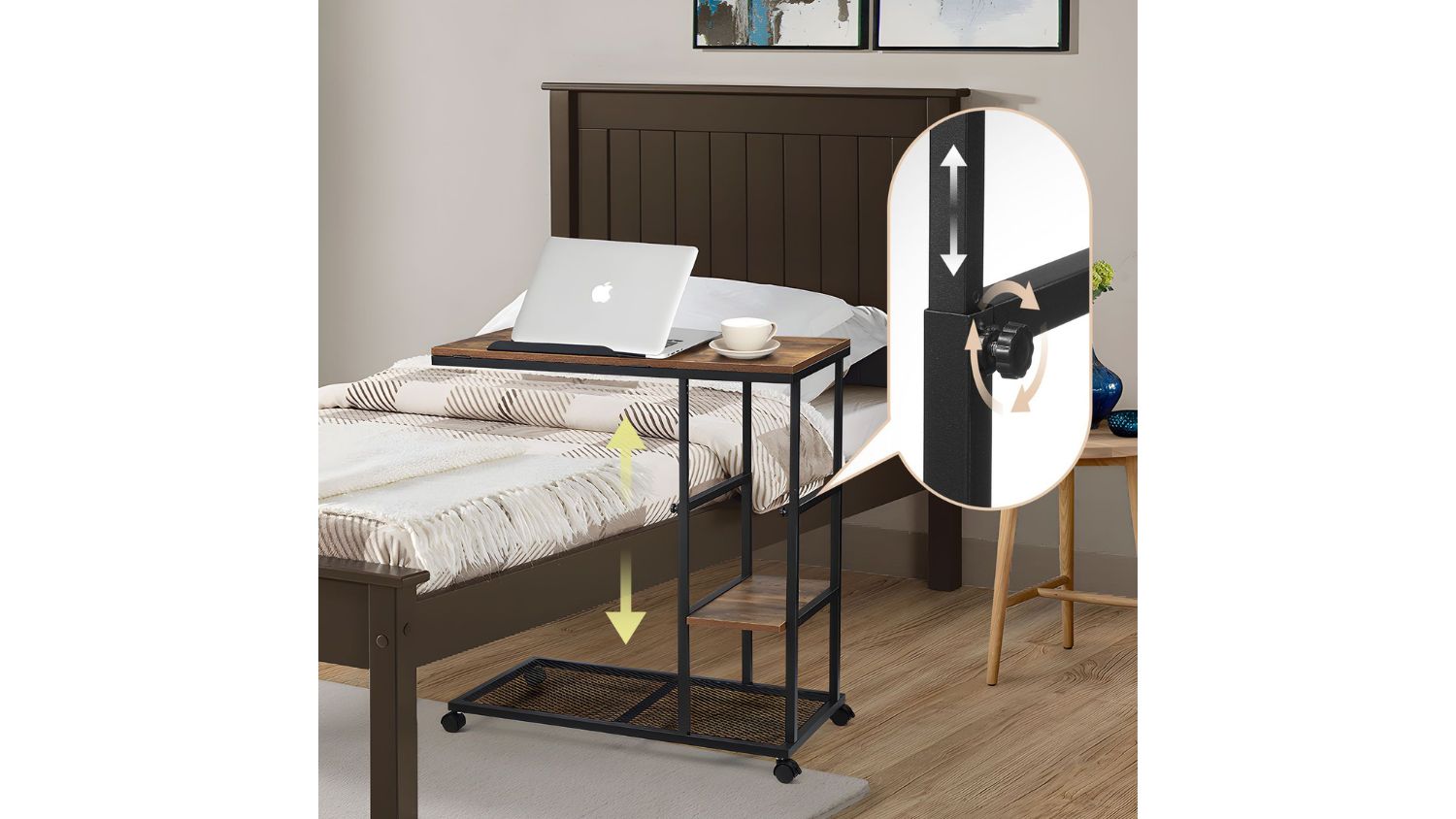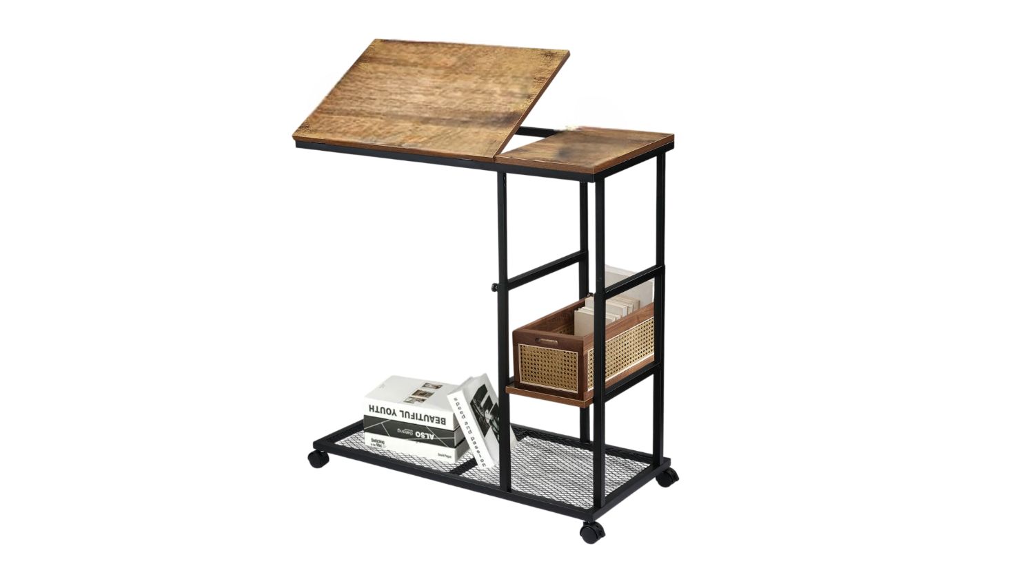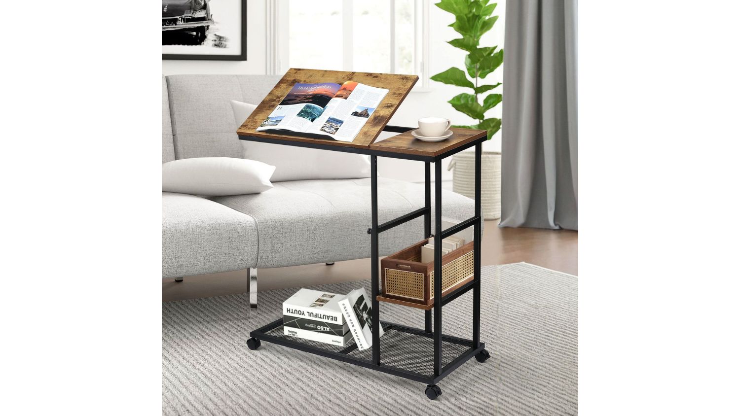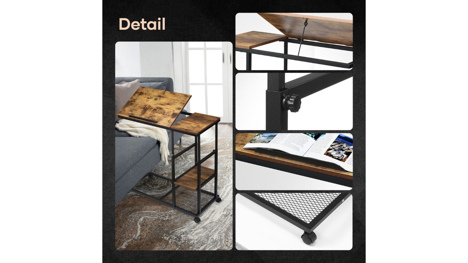 Stay organised and work comfortably with the Luxsuite Sofa Side Narrow Table. Designed for modern living, this adjustable-height workstation fits neatly beside your sofa or bed, giving you an ergonomic setup anywhere. The tiltable top board is perfect for drawing, reading, or digital tasks, while the two storage shelves handle everything from gadgets to snacks.