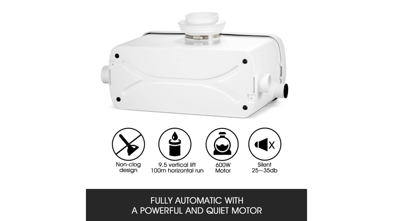 The Maxkon Automatic Sewer Macerator Pump 600W offers reliable performance for efficient wastewater management. With a high flow rate of 300 litres per minute, it easily keeps up with heavy bathroom use while operating quietly in the background. The automatic flush‑activated system provides effortless operation, and three inlet ports allow multiple sanitary fixtures to connect. Equipped with superior seals, a non‑return valve, and stainless‑steel impeller blades, this toilet waste pump prevents backflow and delivers long‑lasting performance, pumping wastewater up to 9.5m vertically and 100m horizontally.