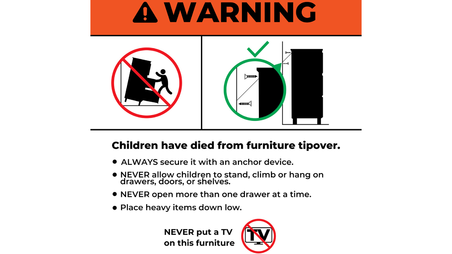 *WARNING: Children have died from furniture tipover. Always secure this furniture with an anchor device. Never allow children to stand, climb or hang on drawers, doors, or shelves. Never open more than one drawer at a time. Place heavy items down low. Never place a television on this furniture.