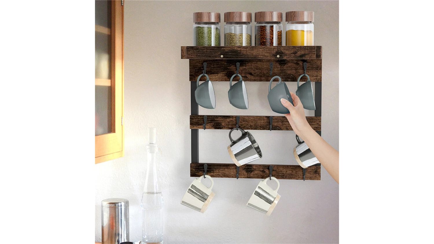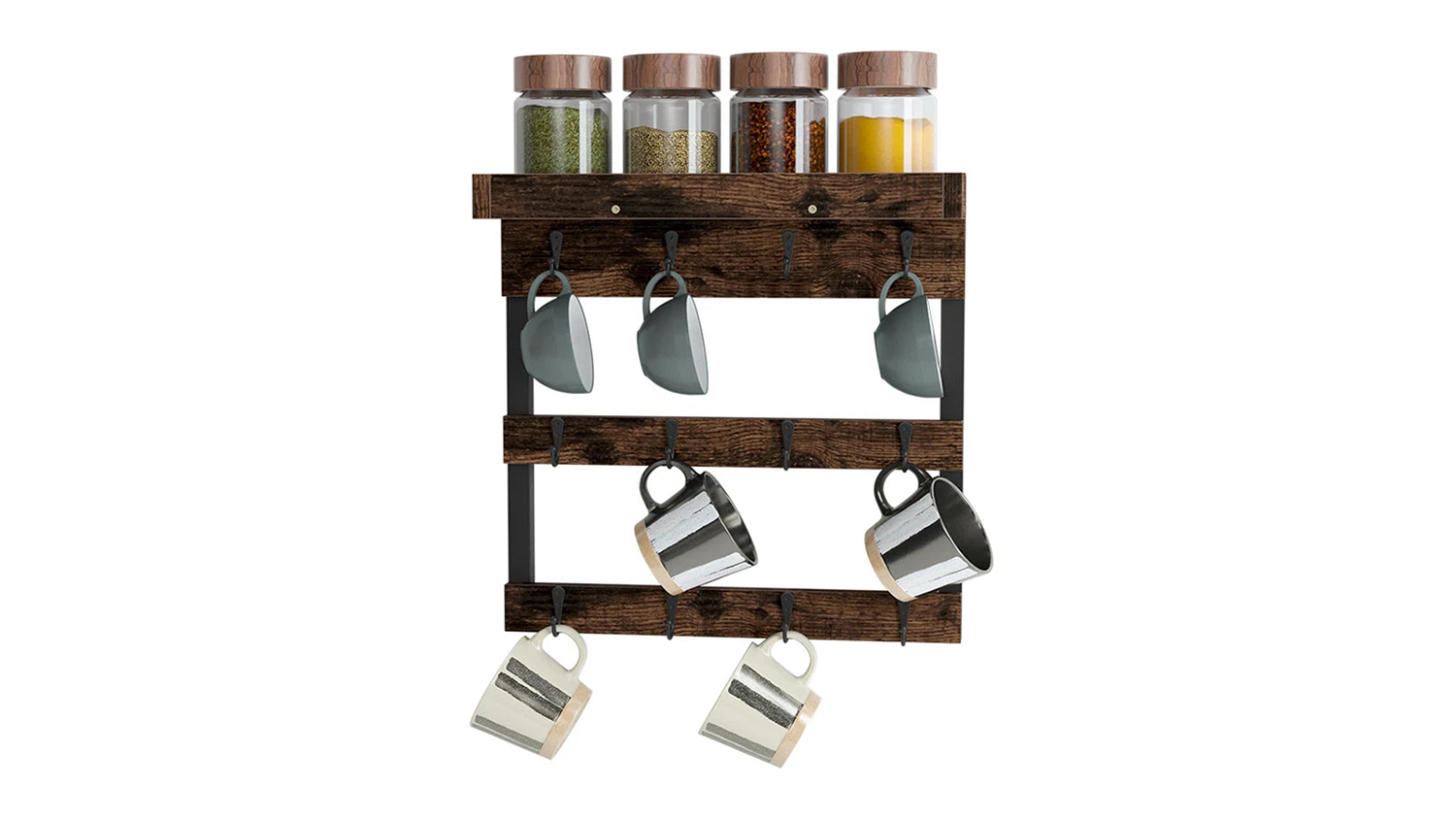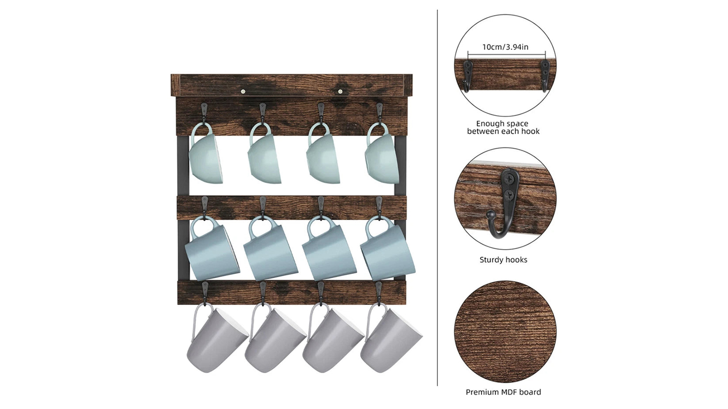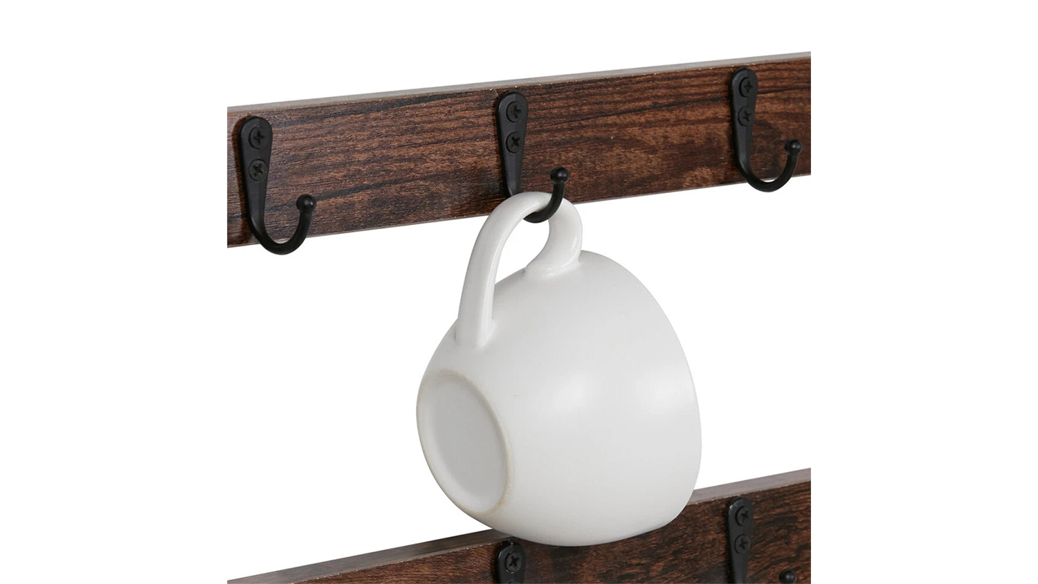 Keep your items beautifully organised with the help of the Pretty & Practical Rustic Wall-Mountable Mug Hooks. These 12 hooks hold all your mugs, while the top layer can display small décor or essentials. It is also constructed from MDF and iron materials, combining superb strength with a timeless rustic style.