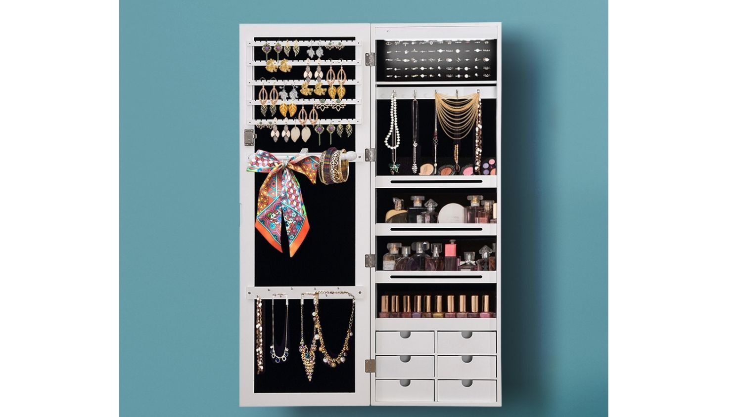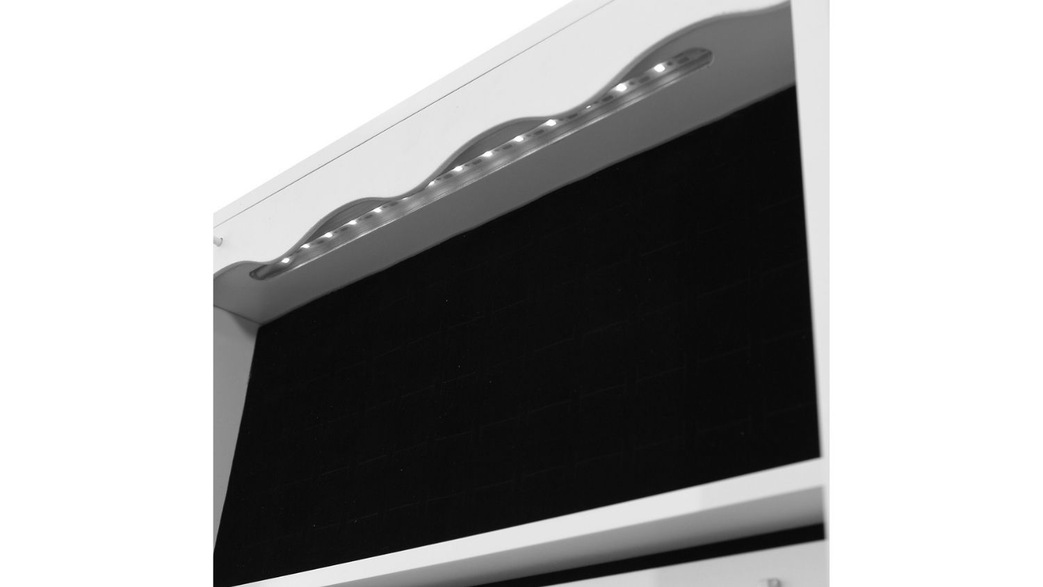 Enjoy a stylish and functional vanity with the Pretty and Practical Vertical Mirror with LEDs, Integrated Jewellery Box. This organiserfeatures a lockable design and a plush interior designed to hold everything from delicate rings to bulky scarves and cosmetics. The built-in LED lights add a touch of luxury, illuminating the various hooks, slots, and shelves so you can find exactly what you need at a glance. Whether you choose the wall-mount or over-the-door setup, this classic piece brings professional-level organisation to any bedroom style.