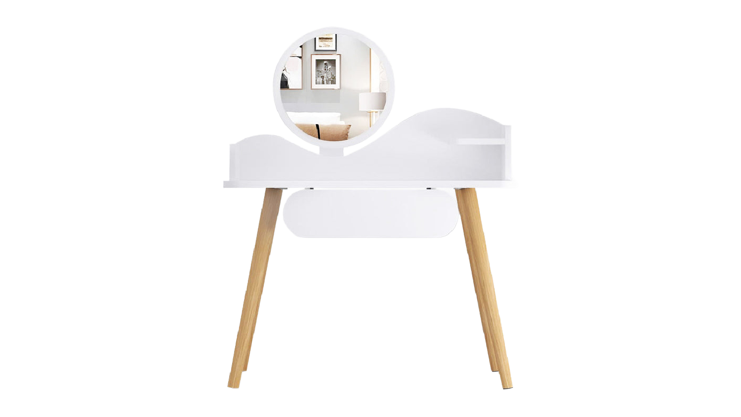 Redefine your dressing space with the TSB Living Modern Dressing Table with Mirror and Drawer. Boasting a sleek design, a vanity mirror, and a practical shelf, it brings a touch of elegance to your space. It is also crafted from MDF board and solid wood legs, embodying both elegance and comfort.