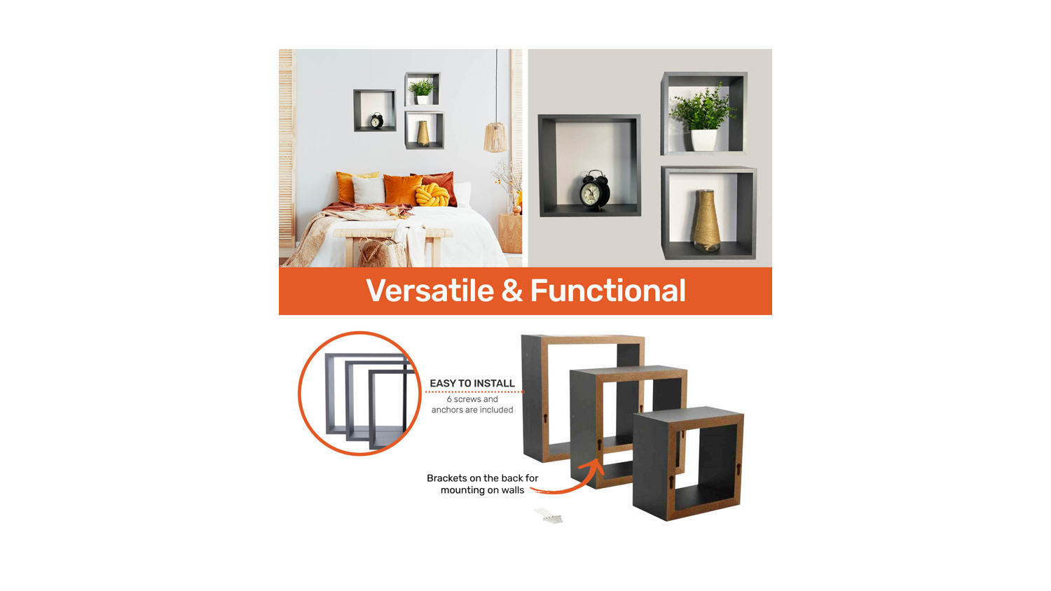 Organise in style with our elegant 3 Piece Floating Cube Shelves! These ingenious shelves offer the perfect balance between form and function. The minimalist design exudes sophistication, while the floating installation adds a touch of uniqueness. With three sizes included, you can create your personalised arrangement, giving your room a modern and organised look.