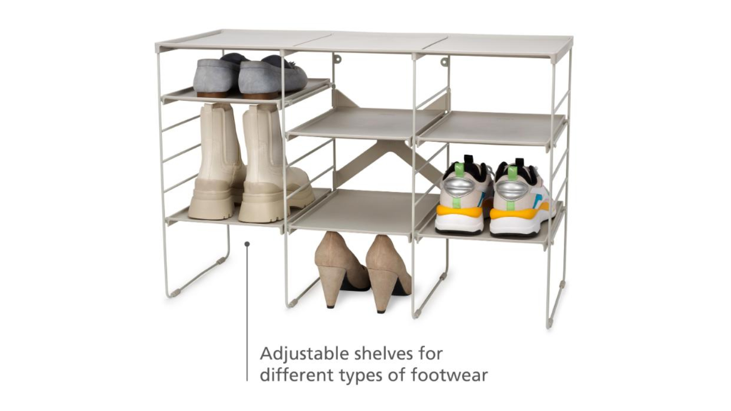 Keep your footwear organised with the Joseph Joseph Level PLUS Adjustable Shoe Rack 75 x 35 x 51cm. With adjustable shelves that accommodate different shoe sizes, this sturdy rack stores up to 12 pairs of shoes or boots. Easy to assemble, it features a tough, powder-coated steel frame and durable shelves. Stackable for extra storage, and can be screwed to the wall for added stability.