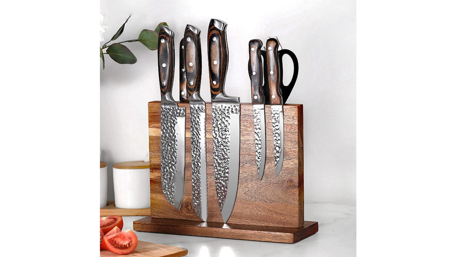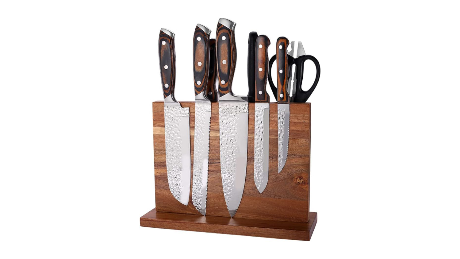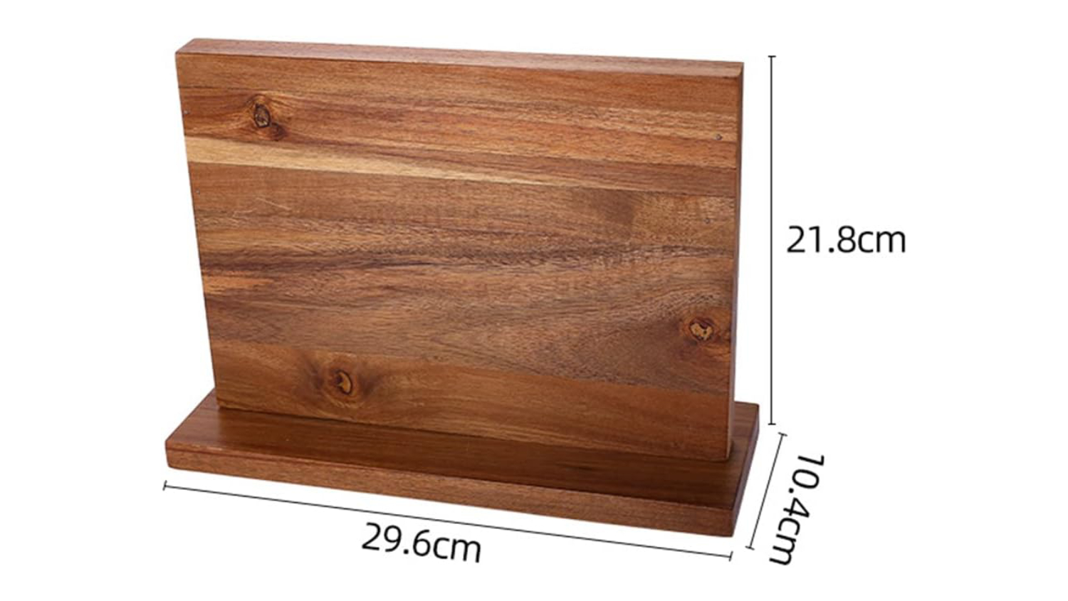 Upgrade your kitchen organisation with the Kmall Dual-Sided Magnetic Knife Holder. This elegant stand is made from beautiful acacia wood and features powerful neodymium magnets on both sides, keeping your knives securely in place. The solid wood surface is easy to clean for better hygiene, while stable rubber feet ensure safety and prevent slipping. To remove a knife, simply twist the handle.