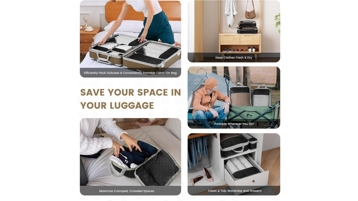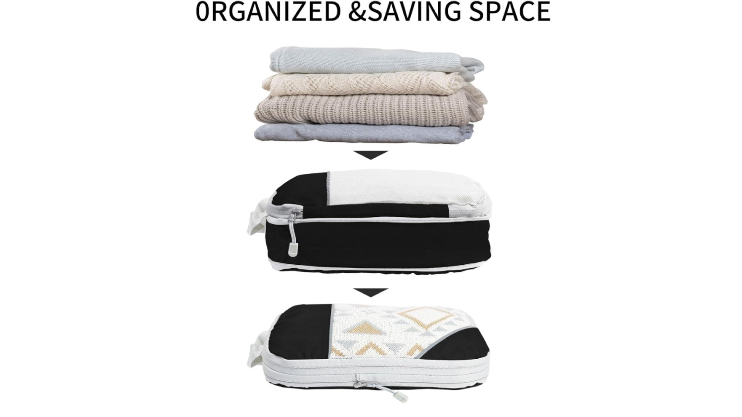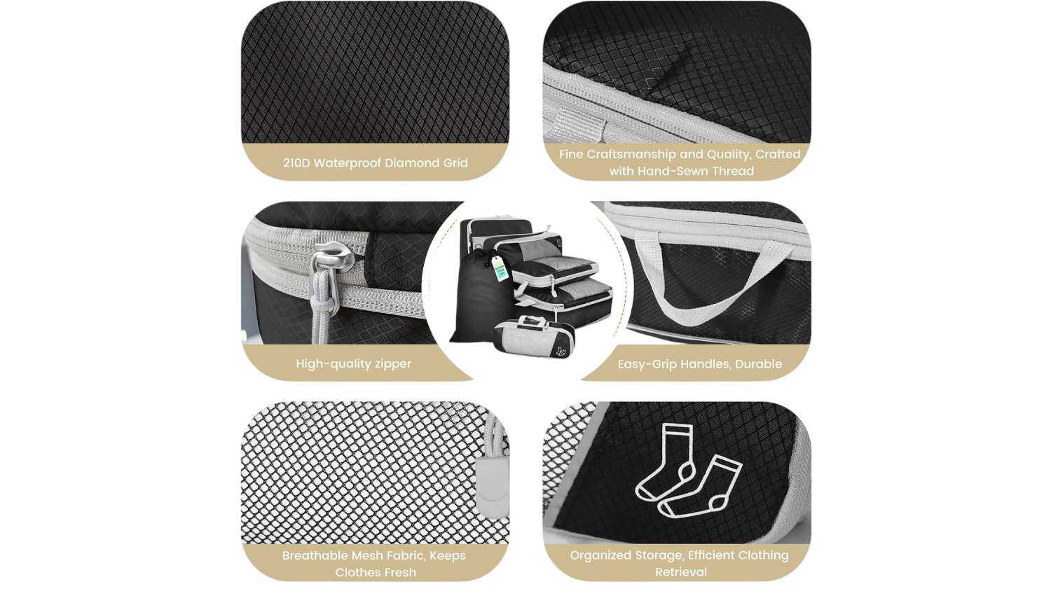 Pack more and stay organised with the Kmall Luggage Organiser Pouch Set. These durable pouches are made from 210D polyester ripstop and mesh fabric. They feature a clever dual-zipper system that flattens contents for extra packing room. It also provides various sizes of bags for all your clothing needs (plus a separate laundry bag).