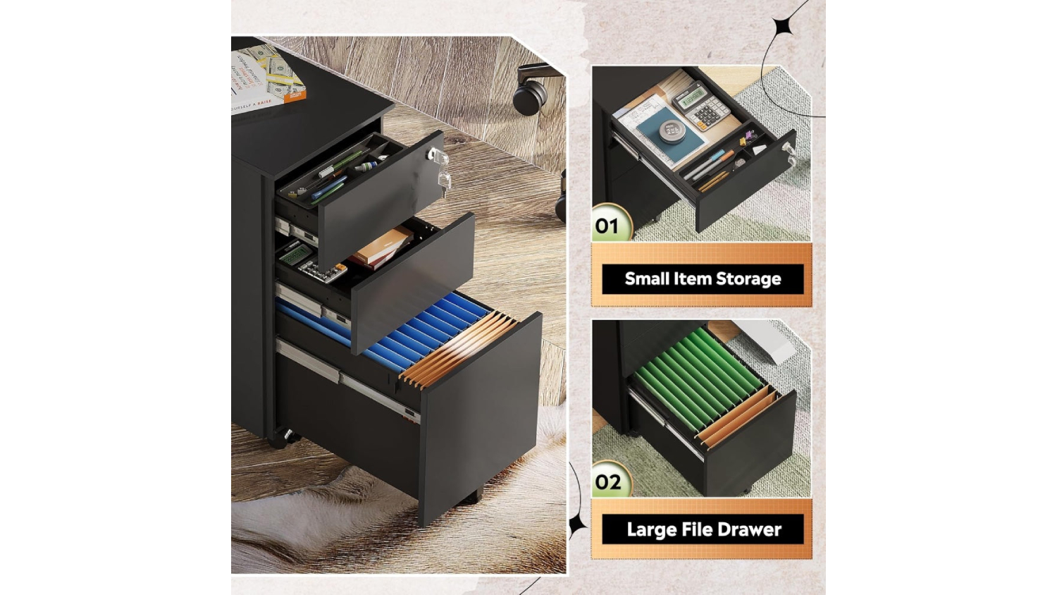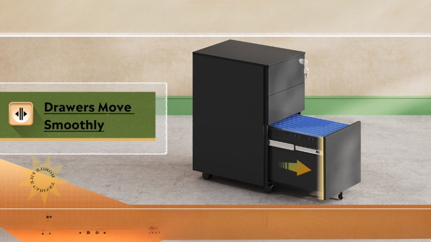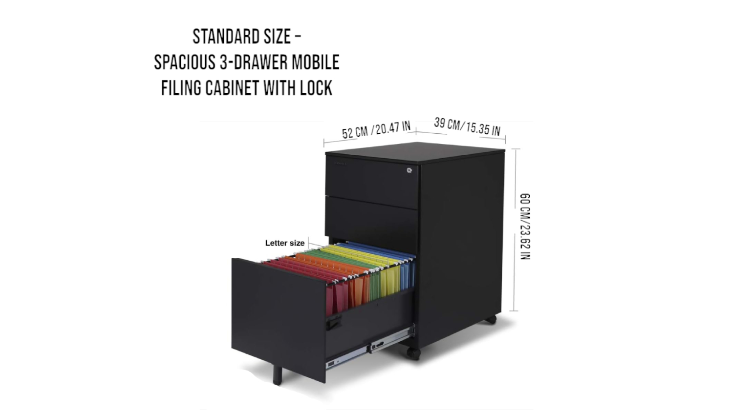 Upgrade your workspace organisation with the Kmall Metal Office Cabinet with Lock, Stationary Tray. This file cabinet offers three functional drawers, including a top utility drawer with a stationery tray and a large bottom drawer for letter-size hanging file folders. For maximum security, the central lock system secures all three drawers with a single key. The unit ensures safe and easy movement via five smooth-gliding casters, including two lockable wheels and a centre anti-tip caster for enhanced stability.