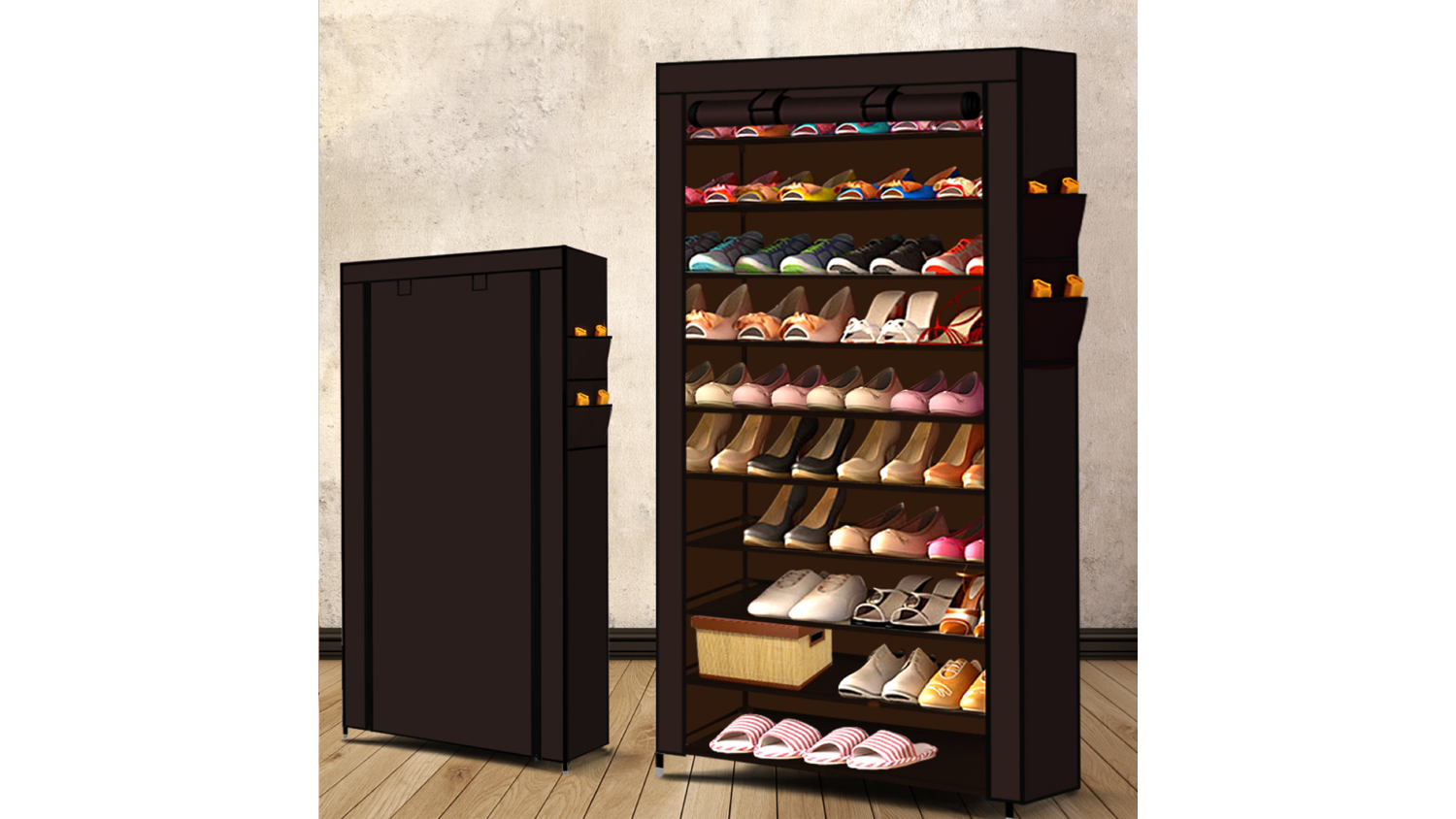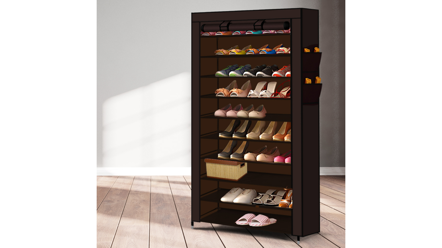 Levede 10 Tier Canvas Shoe Cabinet with Storage Pockets - Brown