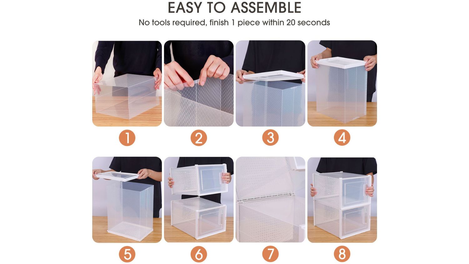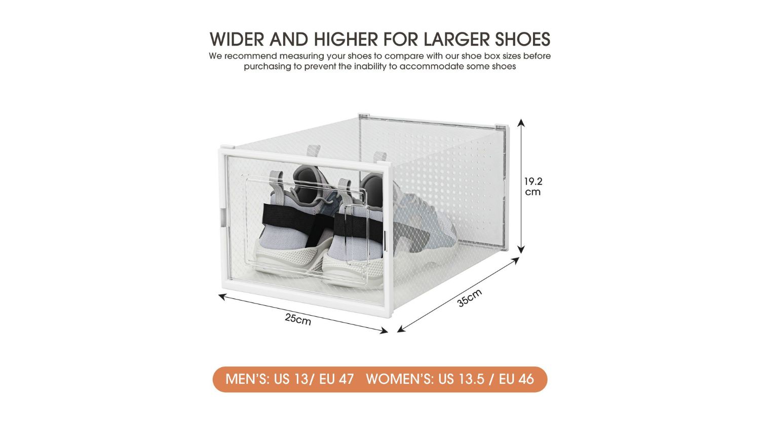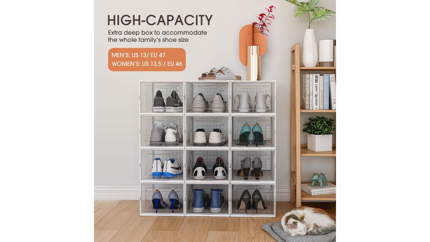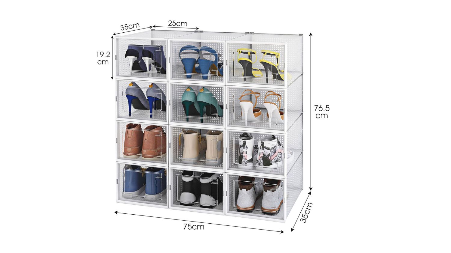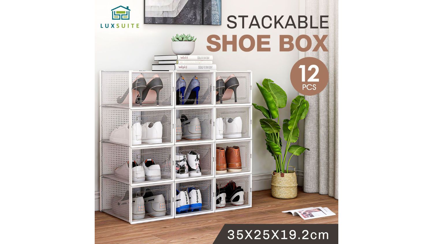 Looking for a stylish way to organise your footwear? The Luxsuite Clear Shoe Organiser 12pcs has got you covered. These clear, stackable storage boxes save space while protecting your shoes from scuffs, dirt, and damage. Each box measures 35 x 25 x 19.2cm, making them perfect for sneakers, trainers, heels, and ankle boots. Made with durable PP and ABS materials, they’re built to resist pressure and stay in shape. It is easy to assemble and disassemble; these boxes fit seamlessly into any part of your home.