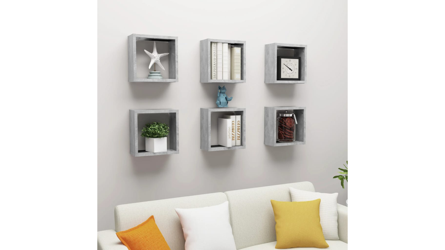 Enhance your living space with the NNEVL Floating Cube Wall Shelves 6pcs. Made from chipboard material, these shelves are perfect for displaying spice jars in the kitchen or picture frames in the bedroom. Now you can save floor space and create chic, functional displays!