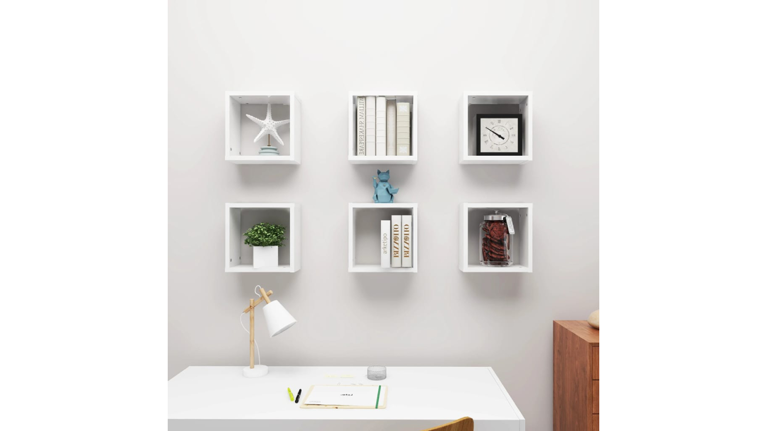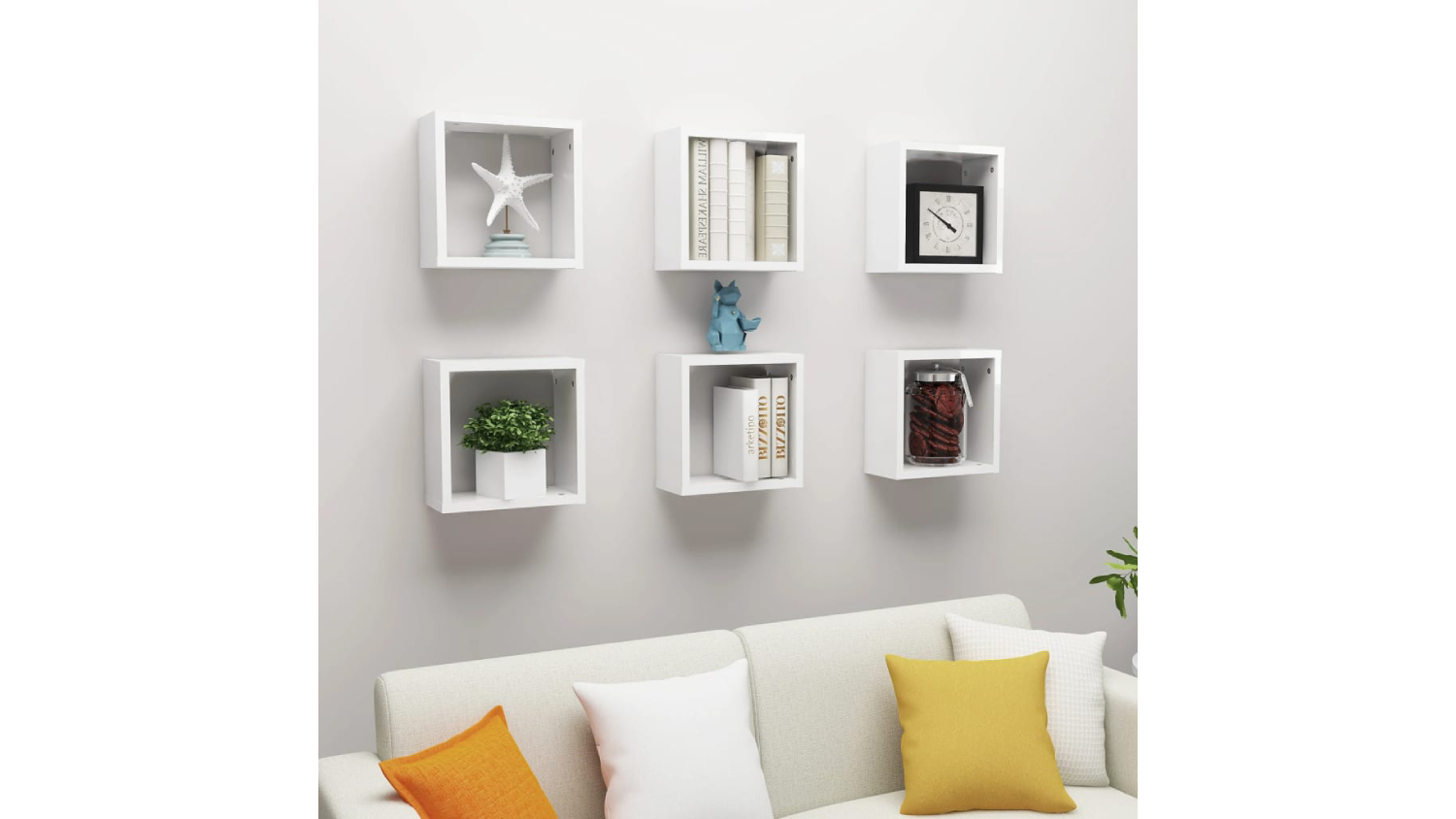 Enhance your living space with the NNEVL Floating Cube Wall Shelves 6pcs. Made from chipboard material, these shelves are perfect for displaying spice jars in the kitchen or picture frames in the bedroom. Now you can save floor space and create chic, functional displays!