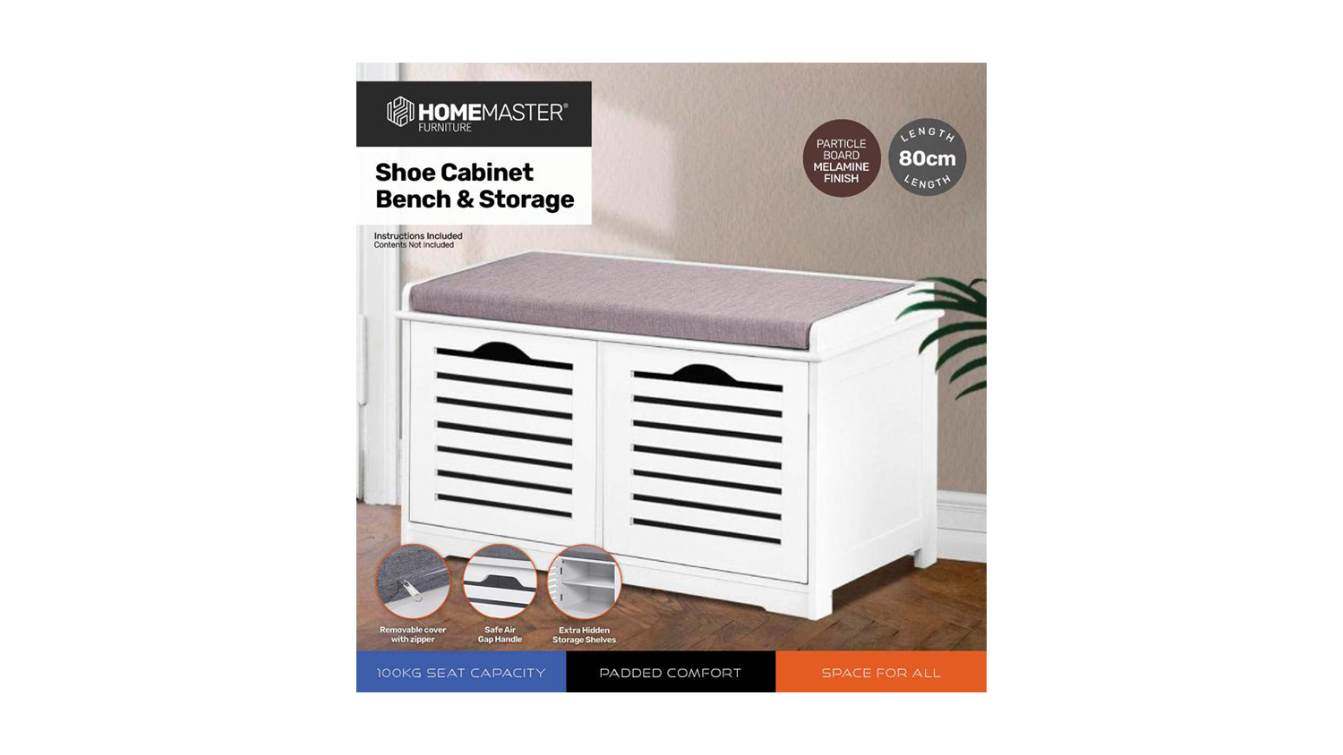 Shoe Cabinet with Removable Cushion Seating - 80 X 35 X 43cm