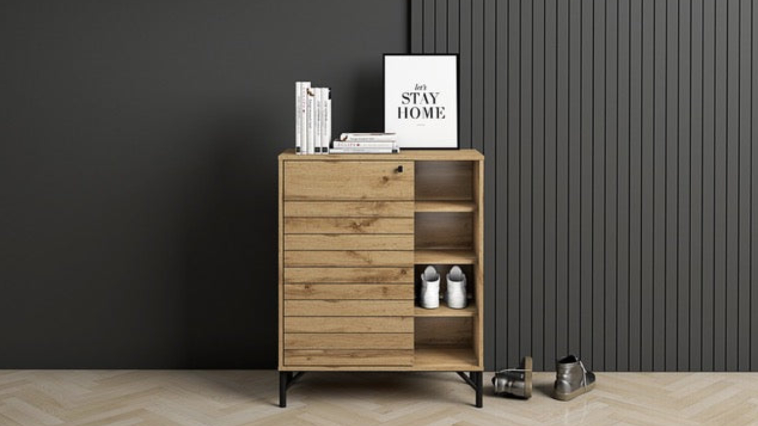 Tidy up your entryway with the stylish TSB Living "Fayt" Shoe Cabinet. Crafted with a natural wood finish and black tubular legs, this storage solution accommodates up to 12 pairs of shoes. The single door keeps your footwear dust-free, while the open shelves offer quick access to your go-to shoes.